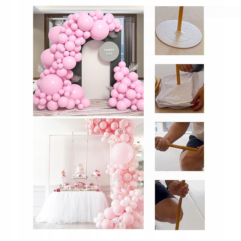 Щоб встановити підставку для повітряної кулі, спочатку потрібно підключити тверду трубу та шланг, а потім наповнену сумку з водою до основи. Кліпи з повітряних куля дозволяють прикріпити повітряні кулі. Повітряну дугу можна повторно використати.