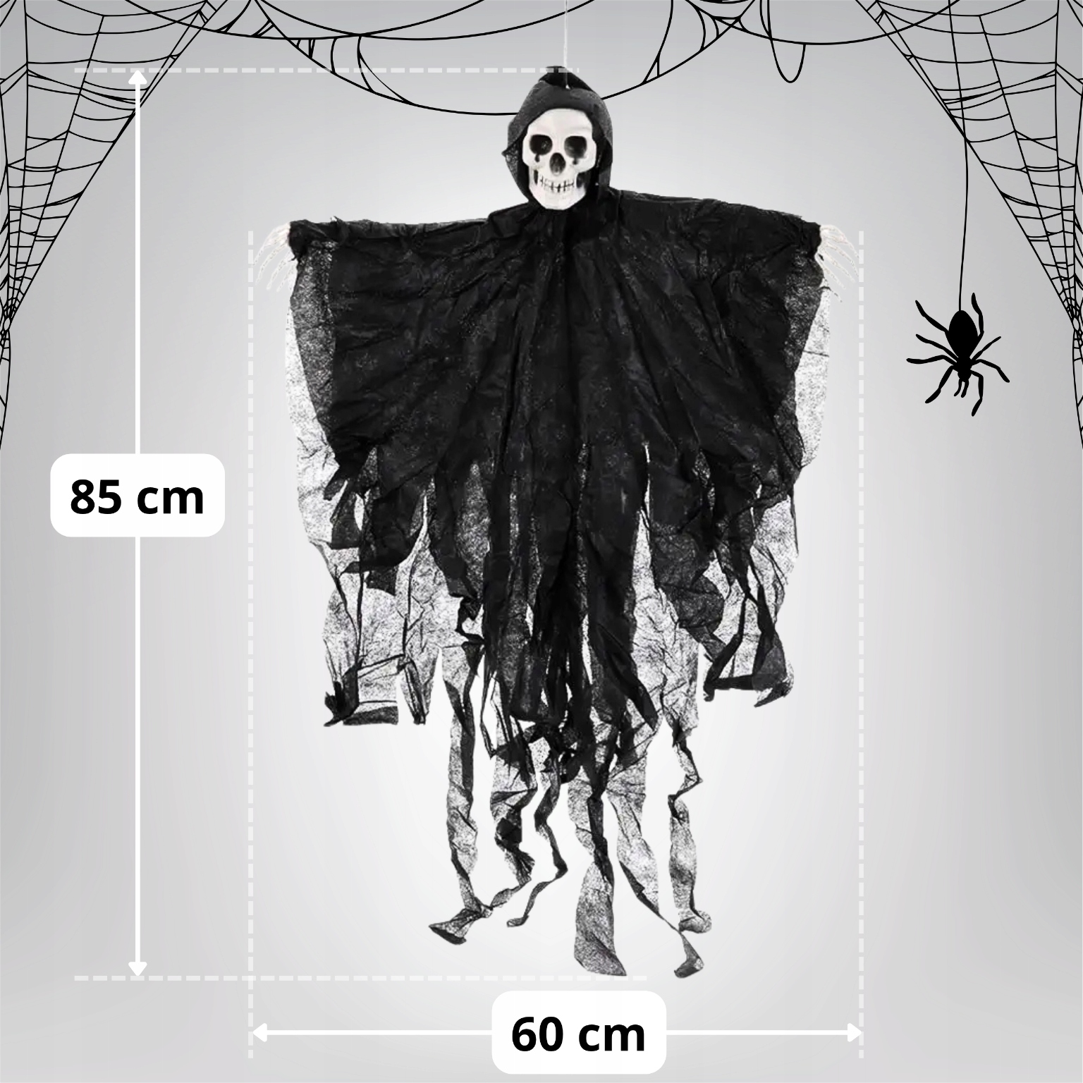 Чорний привид із черепом і кістлявими руками є класичним символом жаху. Реалістичні деталі додають його жахливого характеру. Ідеально підходить як прикраса інтер'єру та саду.