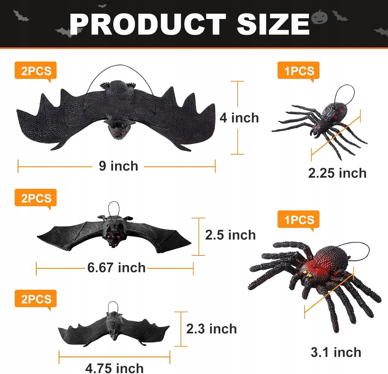 ✅ Набір включає: Набір складається з 8 прикрас: два кажани завдовжки 24 см, два 17 см завдовжки, два 14 см і два павуки розміром 15 см і 11 см. Різні розміри дозволяють легко відповідати різним пробілам.