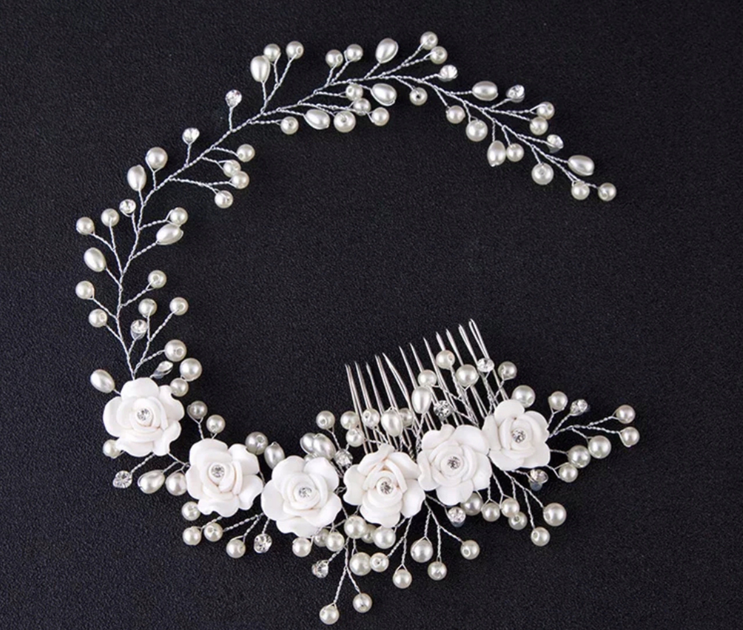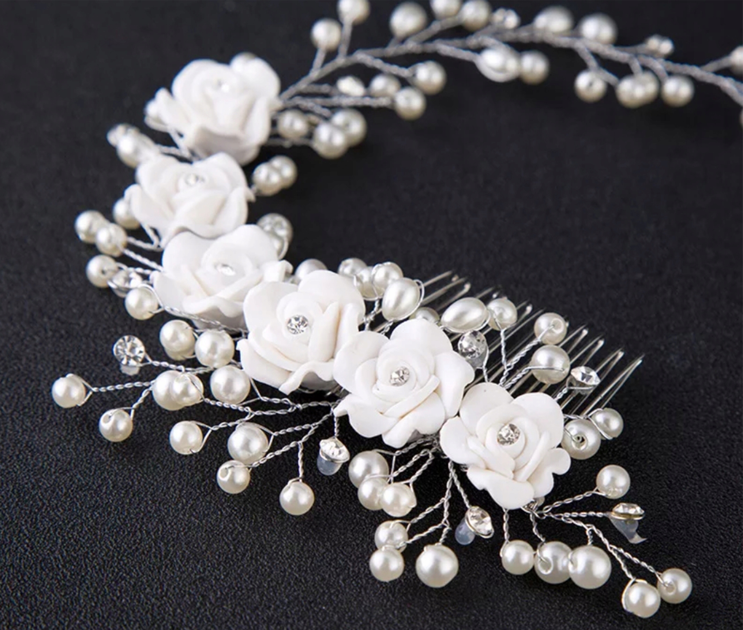 Унікальний гребінець для спілкування або весілля, прикрашеного білими трояндами та штучними перлами та цирконами. різними способами. Білий