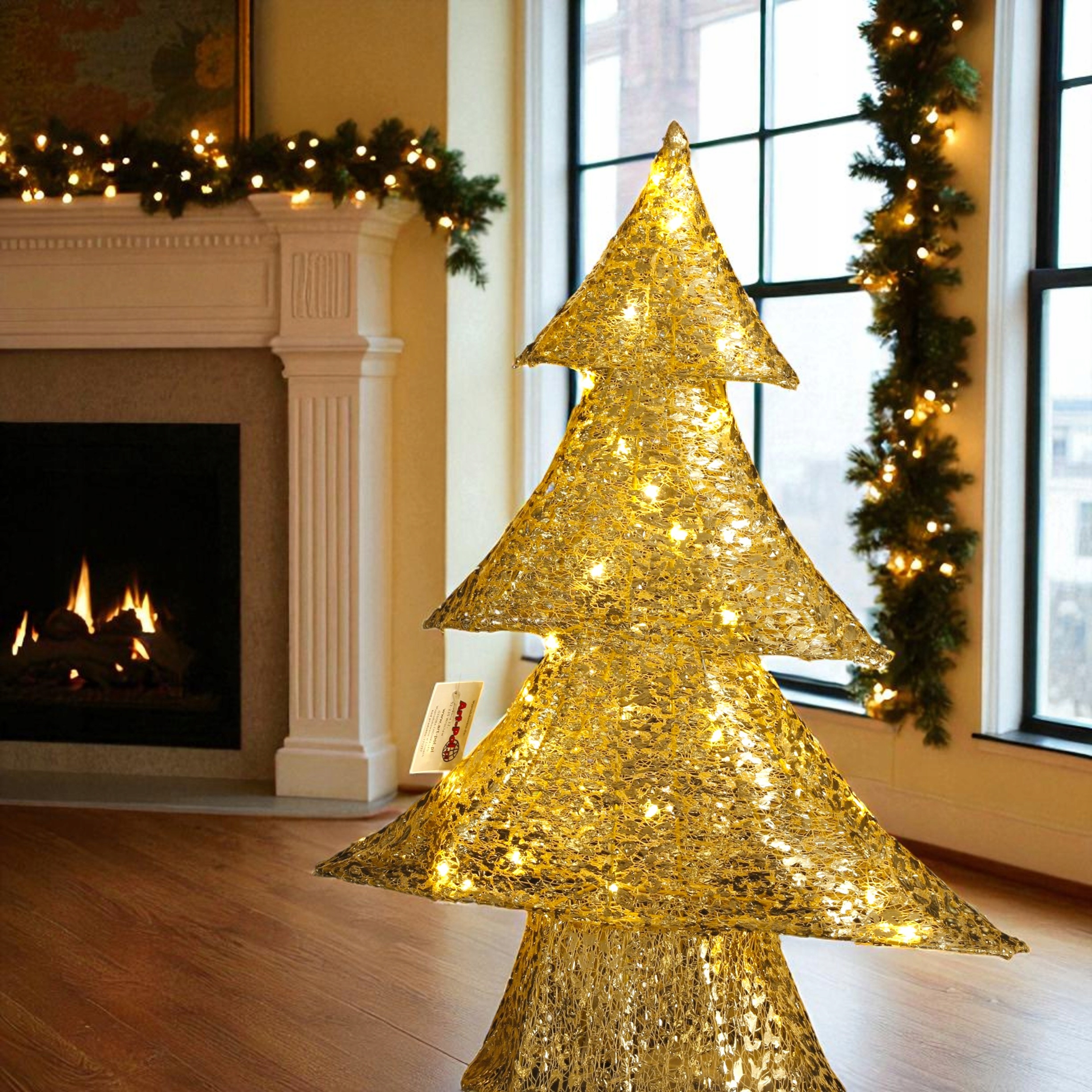Введіть чарівну атмосферу Різдва до вашого будинку завдяки унікальній світлодіодній прикрасі у формі ялинки. Золота прикраса, виготовлена з елегантного дизайну тканини та металу, тонко відволікає світло 30 теплих світлодіодних вогнів, створюючи похмуру та затишну атмосферу.
