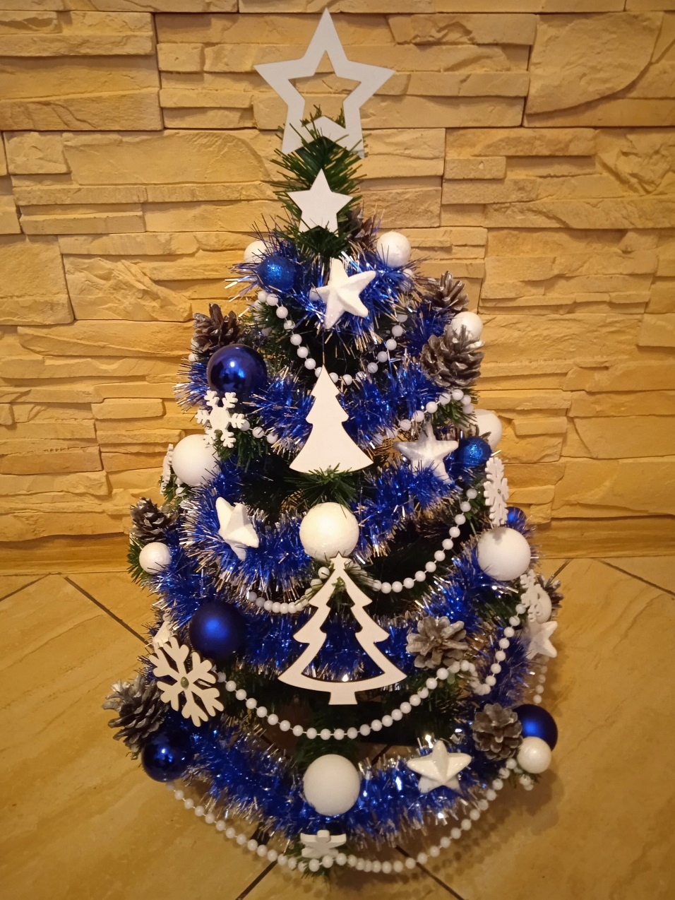 Різдвяна ялинка з золотим і синім кольорами з органзою – це новорічна ялинка із золотою органзою та золотими та синіми аксесуарами.