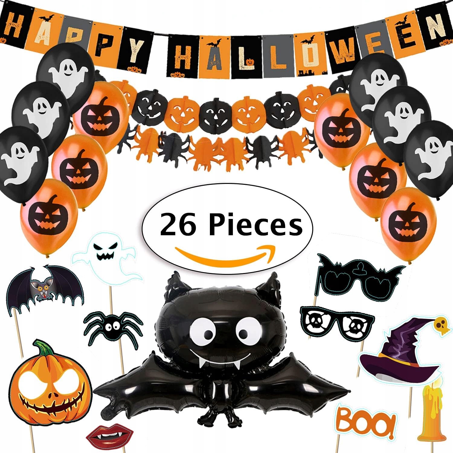 У наборі є все необхідне для створення жахливої атмосфери! Тут ви знайдете банер «Happy Halloween», гірлянди з гарбузами та павуками та повітряні кулі з мотивом гарбуза та привидів, які порадують ваших гостей.