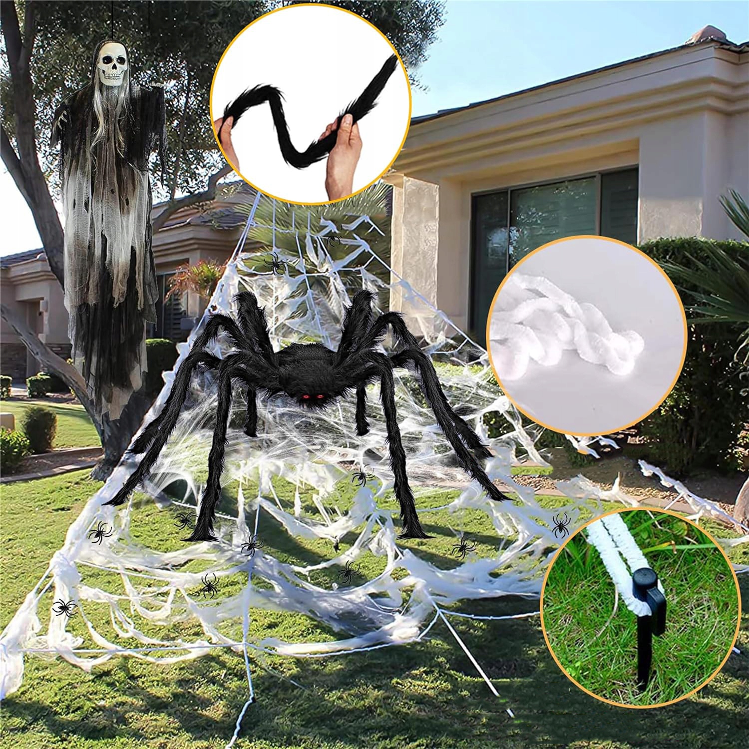 🕸️🕸️Набір павуків на Хелловін: містить трикутну павутину довжиною 5 м, чорного павука 125 см/30 см, 10 мініатюрних іграшок-павуків павуків і 50 г гнучкої павутини. Ви можете розкласти його в саду, на газоні, стінах, освітленні, обідньому столі тощо. Він наповнить весь ваш будинок моторошною атмосферою Хелловіна, зроблячи цьогорічне святкування ще більш захоплюючим.