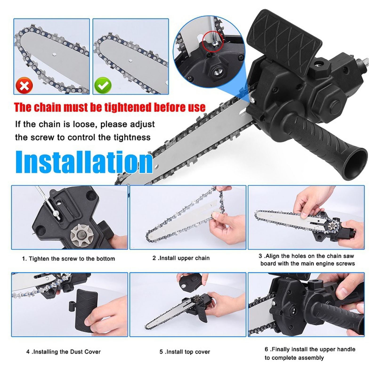 4. Допоміжна ручка: Цей адаптер для перетворення ланцюгової пилки оснащений допоміжною ручкою анти -Slip, яка може покращити більшу стабільність.
