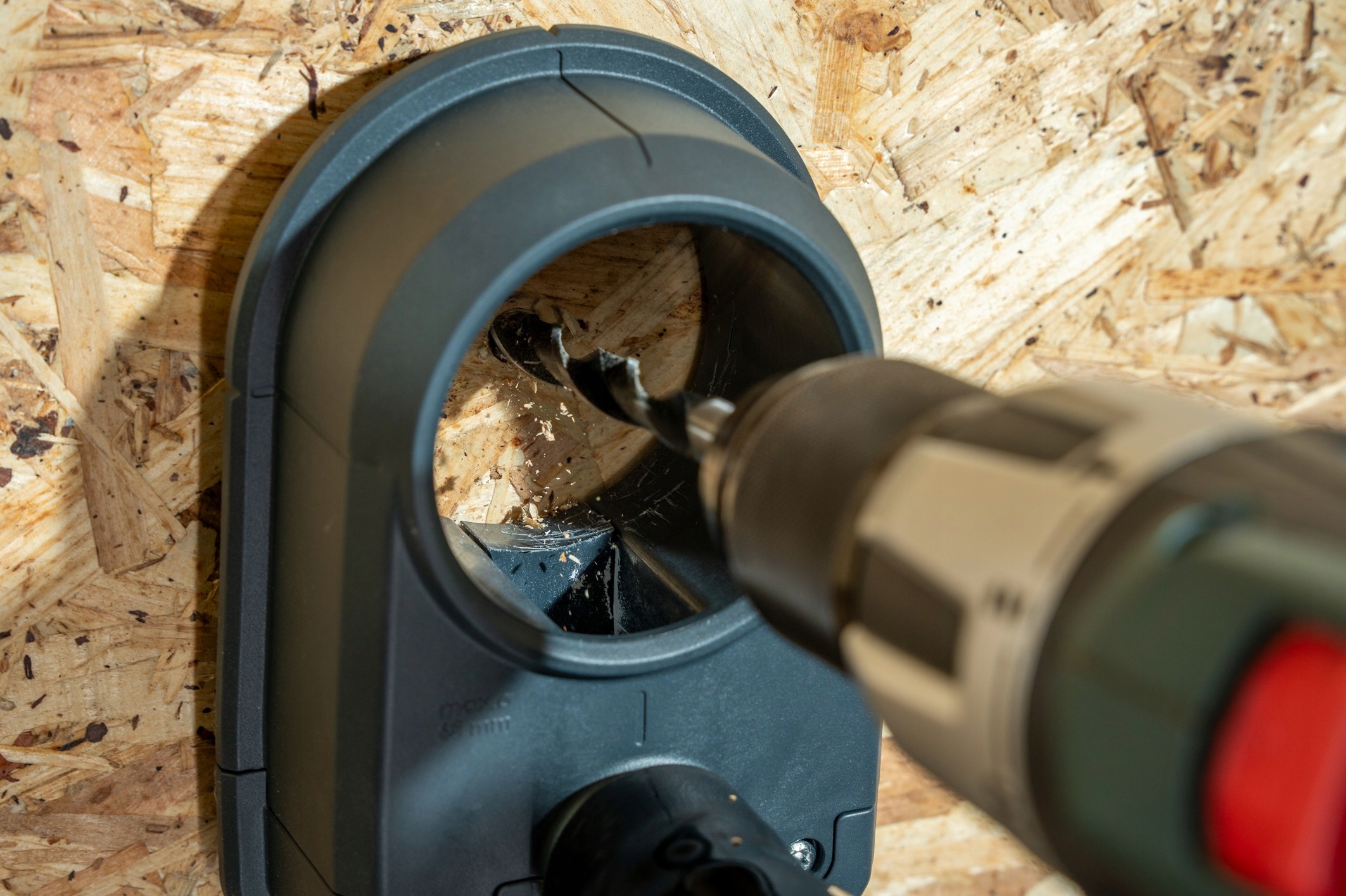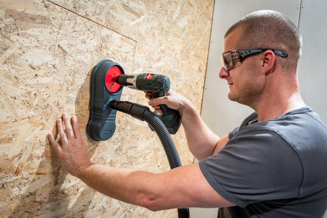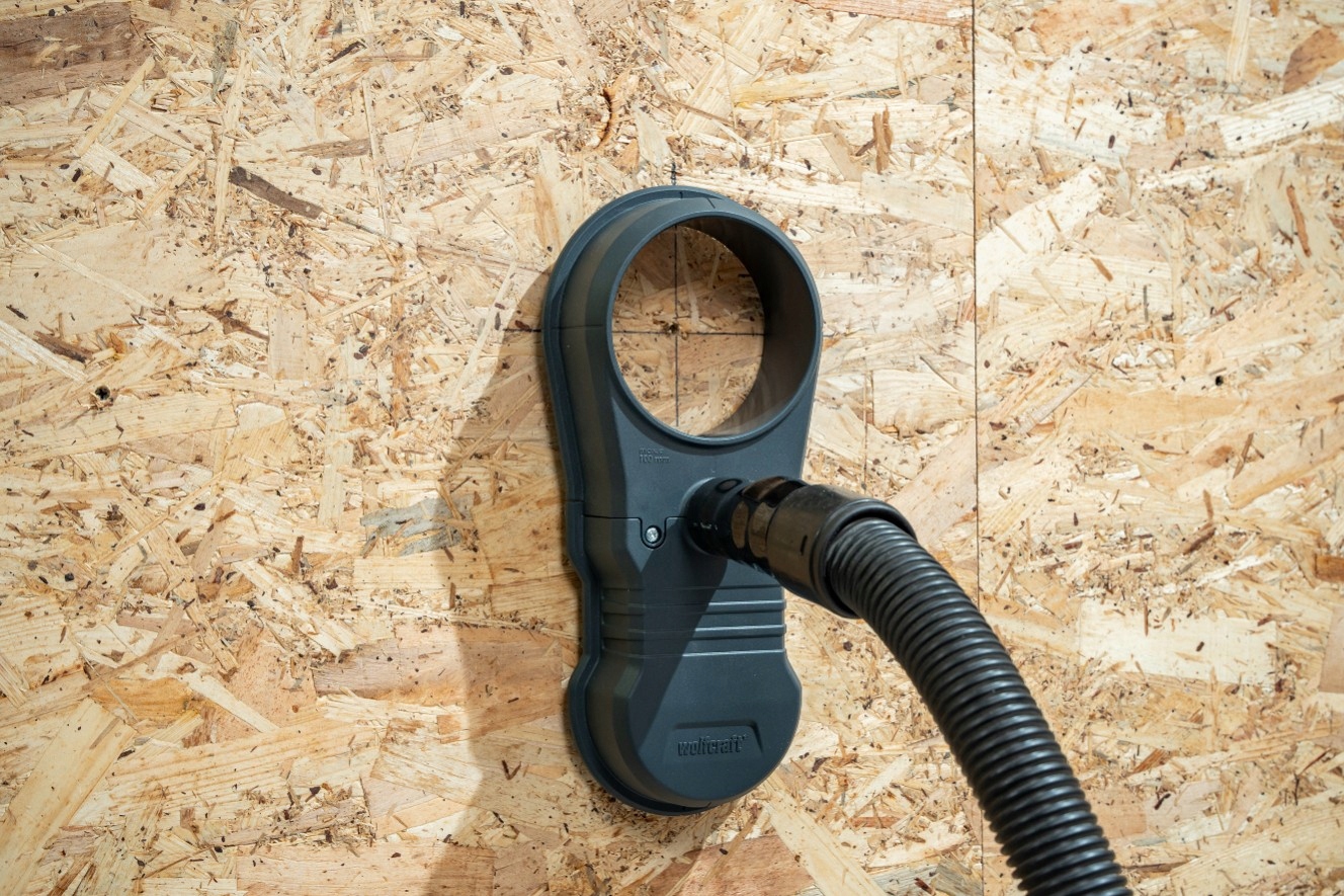 ◼ ➡ Універсальна система всмоктування пилу Wolfcraft 38/100 забезпечує оптимальну підтримку з низьким пилом бурінням, наприклад за допомогою отворів або дрилів