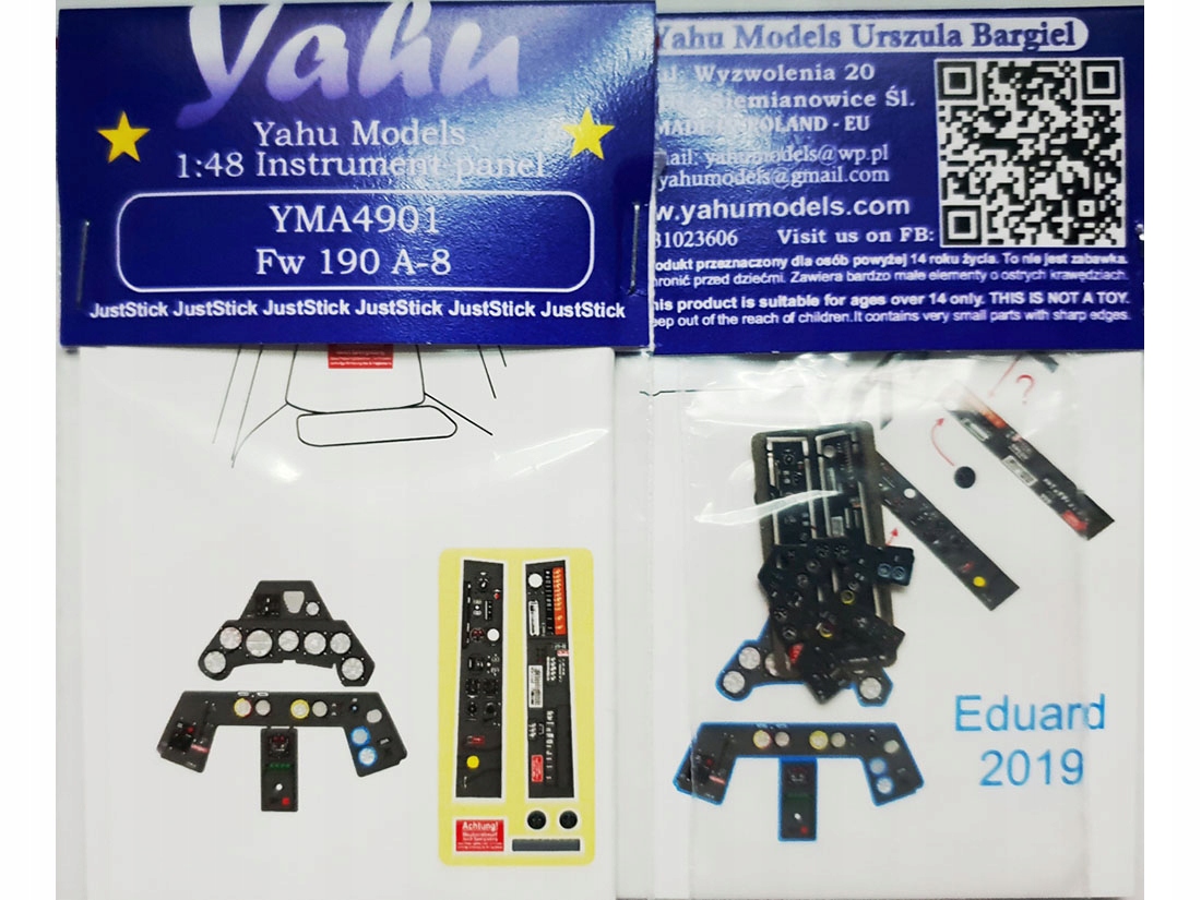 Кольорова панель приладів із фотогравіруванням, готова до встановлення на моделі (JustStick). Набір деталей з фототравленням для валоризації моделей, призначених для використання в моделях літаків Focke Wulf Fw190 A-8, в масштабі 1:48 з пропозиції компанії Eduard (2019).