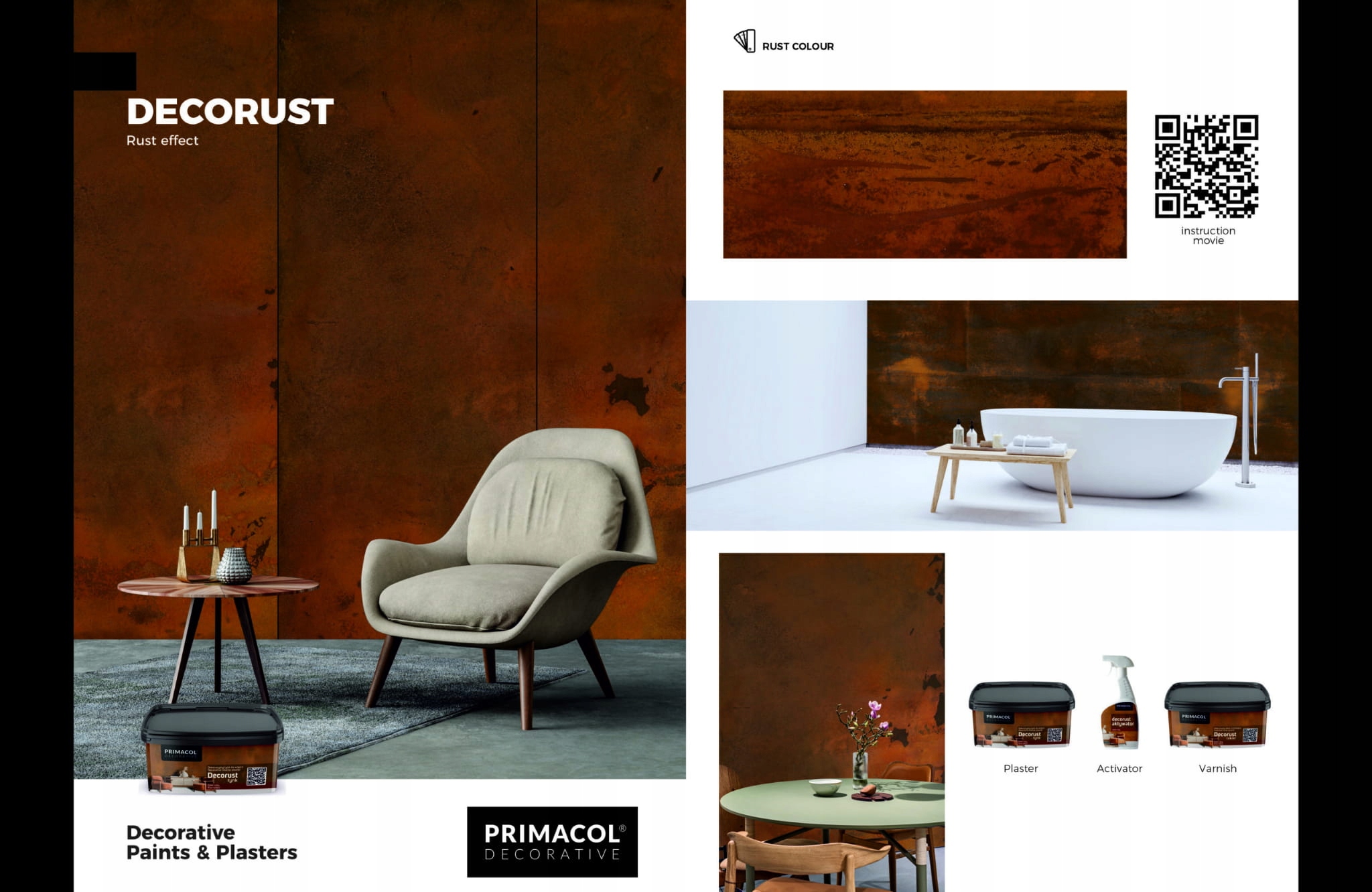 DECORUST rust effect varnish - безбарвний захисний лак. Зупиняє корозію, зміцнює поверхню та захищає її від бруду. Трохи затемнює ефект іржі, підкреслюючи багатовимірність декору.