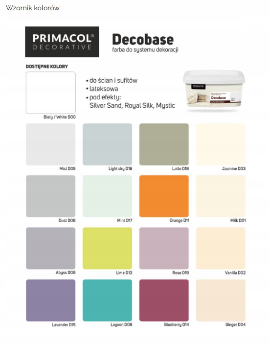 декобаза - це латексна емульсійна фарба для стін та всередині стінок. Він характеризується чудовим покриттям, міцністю та стійкістю до повторного промивання водою з додаванням миючих засобів. Фарба призначена для фарбування поверхонь мінеральних та гіпсових пластерів, пластини G-K, цегли, дерев’яних та дерев’яних поверхонь та шпалер зі склопластику. Рекомендується спеціально для використання в якості шарів ґрунтовки для декоративного ефекту декоративного Primacol: срібний пісок, королівський шовк, містична система. Також рекомендується для ефектів, виконаних за допомогою лаку для тріщин та декоративного паперу.