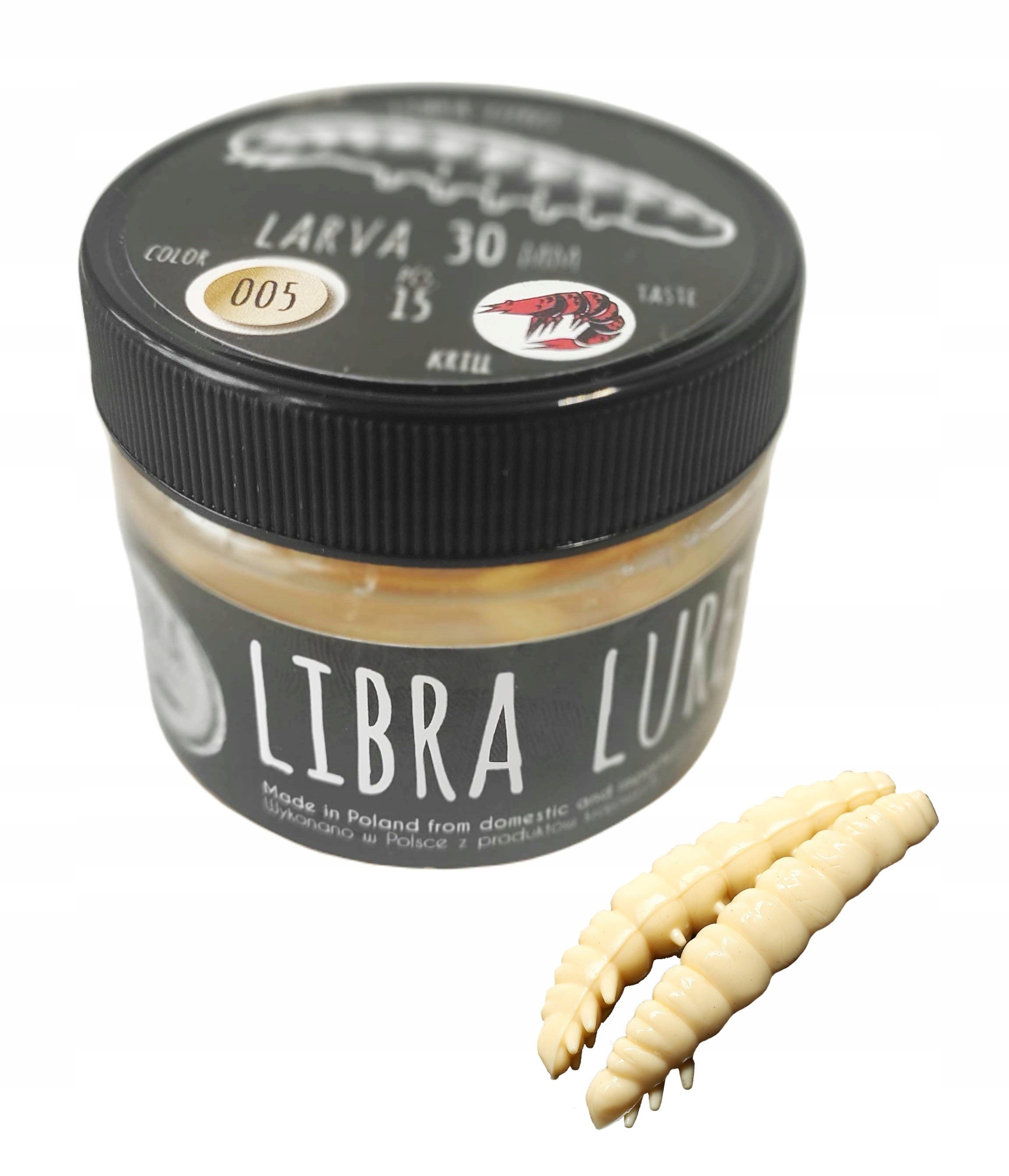 Larva — флагманська модель Libra. Личинки – найбільш часто споживаний корм форелі, головня, язя та сига, незалежно від пори року. Сотні годин випробувань, аналізів і метаморфоз цієї моделі призвели до точної імітації личинки, її відповідна геометрія та використання унікальної суміші роблять її майже ідеальною приманкою, завдяки чому вона добре працює як у проточних, так і в стоячих водах. . Larva, безсумнівно, буде конкурентоспроможним вбивцею також на змаганнях Trout Area під час лову райдужної форелі та інших риб із родини лососевих. Лялечка комах є основною їжею багатьох видів риб. Унікальні властивості матеріалу роблять жирну м'яку лялечку непереборною навіть для найобережнішої форелі. Ретельно продумана форма приманки дозволяє їй реагувати навіть на найменший рух кінчика. Це дає широкий спектр можливостей, від природної презентації до т.зв перехід до різних видів анімаційних технік.
