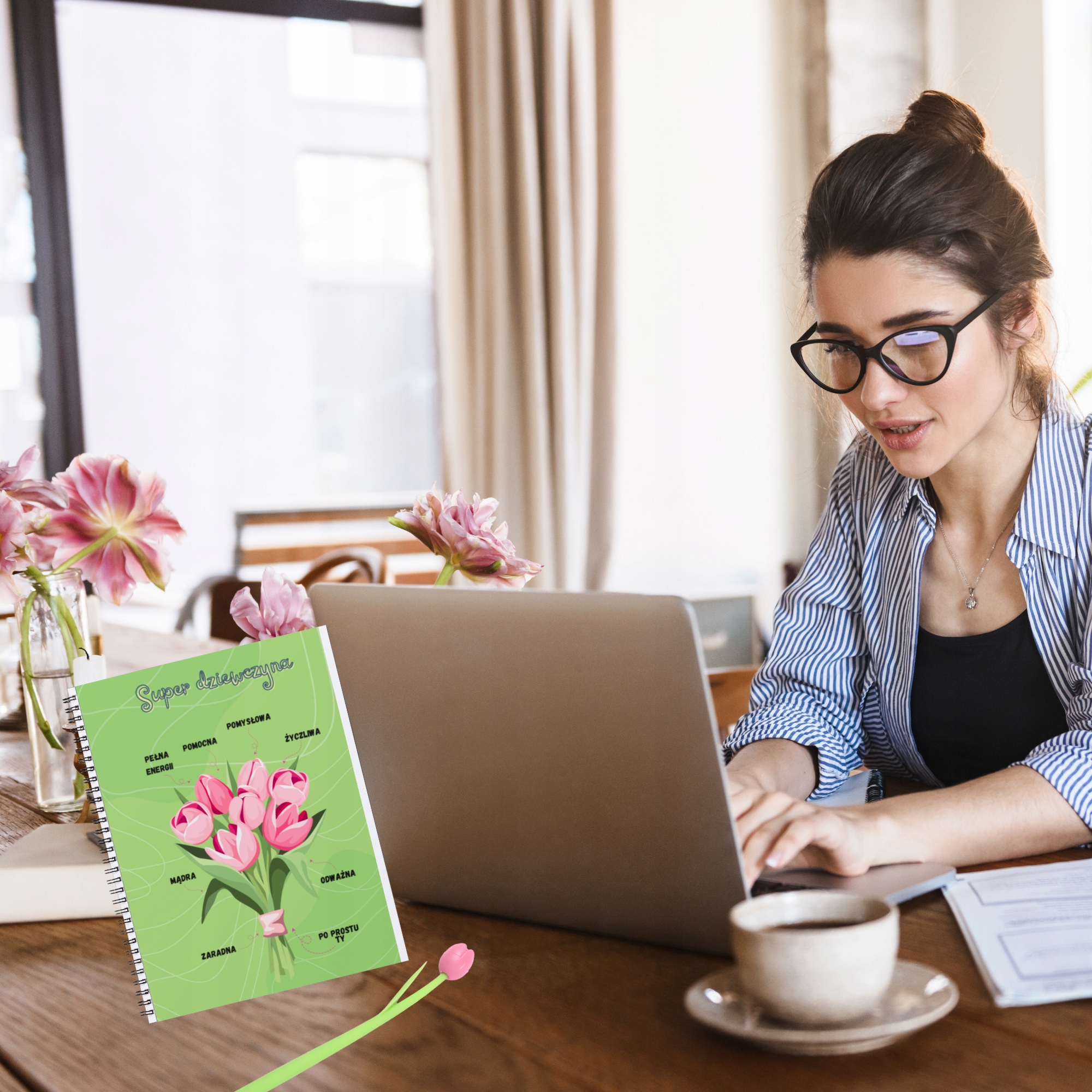 - Красиві, практичні та сповнені натхнення! Він складається з нот (50 карт у рядках), наконечника та трьох тюльпанових ручок . Це ідеальний подарунок для людей, які цінують прекрасні аксесуари, організацію та творчість . Мотив тюльпанів та гасел, що підкреслюють риси "чудових дівчат", робить набір вражаючим своїм повідомленням. Відмінно для жінок, день народження або просто як приємний жест ! Ноутбук "Super Girl" - 50 карт у рядках для щоденних нот