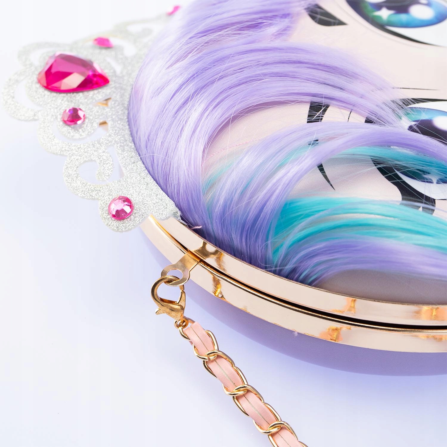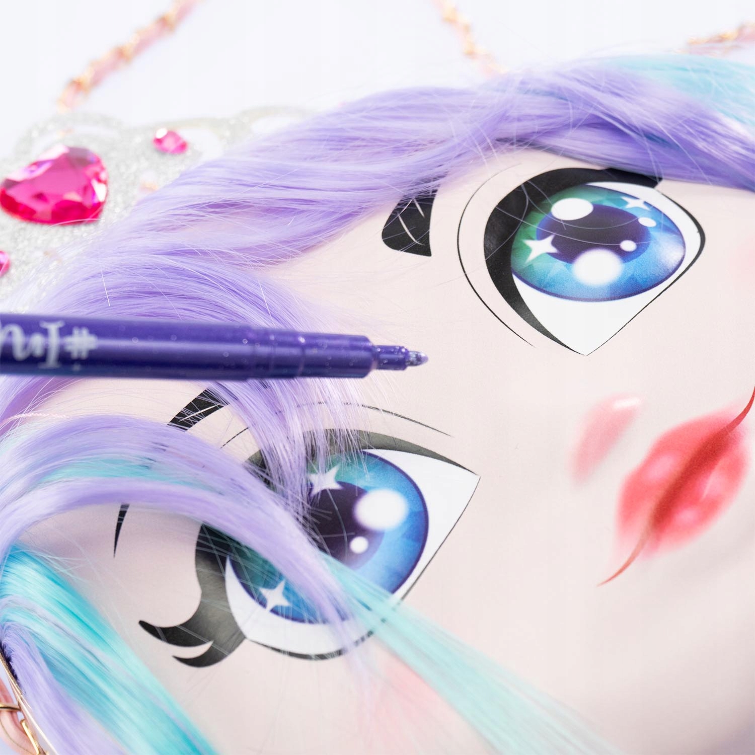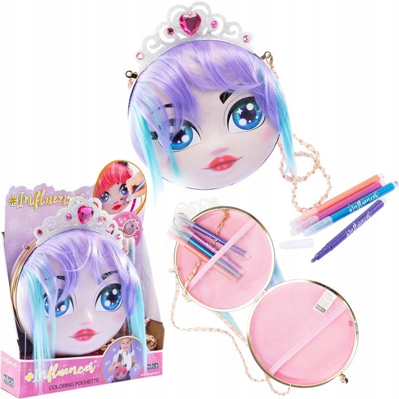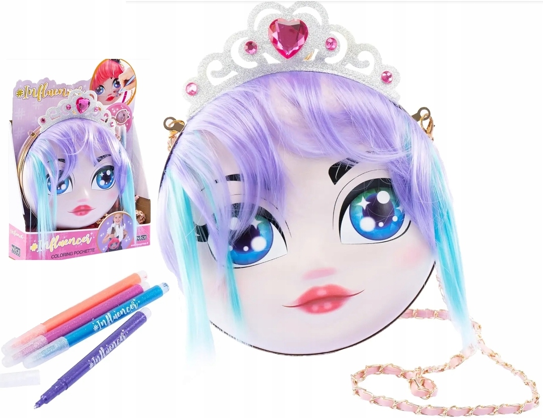 сумки з елегантним ланцюговим плечовим ремінцем - це не лише практичне доповнення, але й творча іграшка. Кожна сумка - це також лялька з можливістю багаторазового забарвлення та стилізації! Завдяки прикріпленим миттям маркерів ви можете застосувати макіяж на обличчі та розфарбувати волосся ляльки, а потім легко мити все і почати знову. Доступні блискітні вуха або тіара, прикрашені коштовностями, що він додає чарівності. Сумки мають напів -рідку структуру, закриту засувкою, а всередині є практичний сітчастий кишеню, ідеально підходить для дрібних предметів.