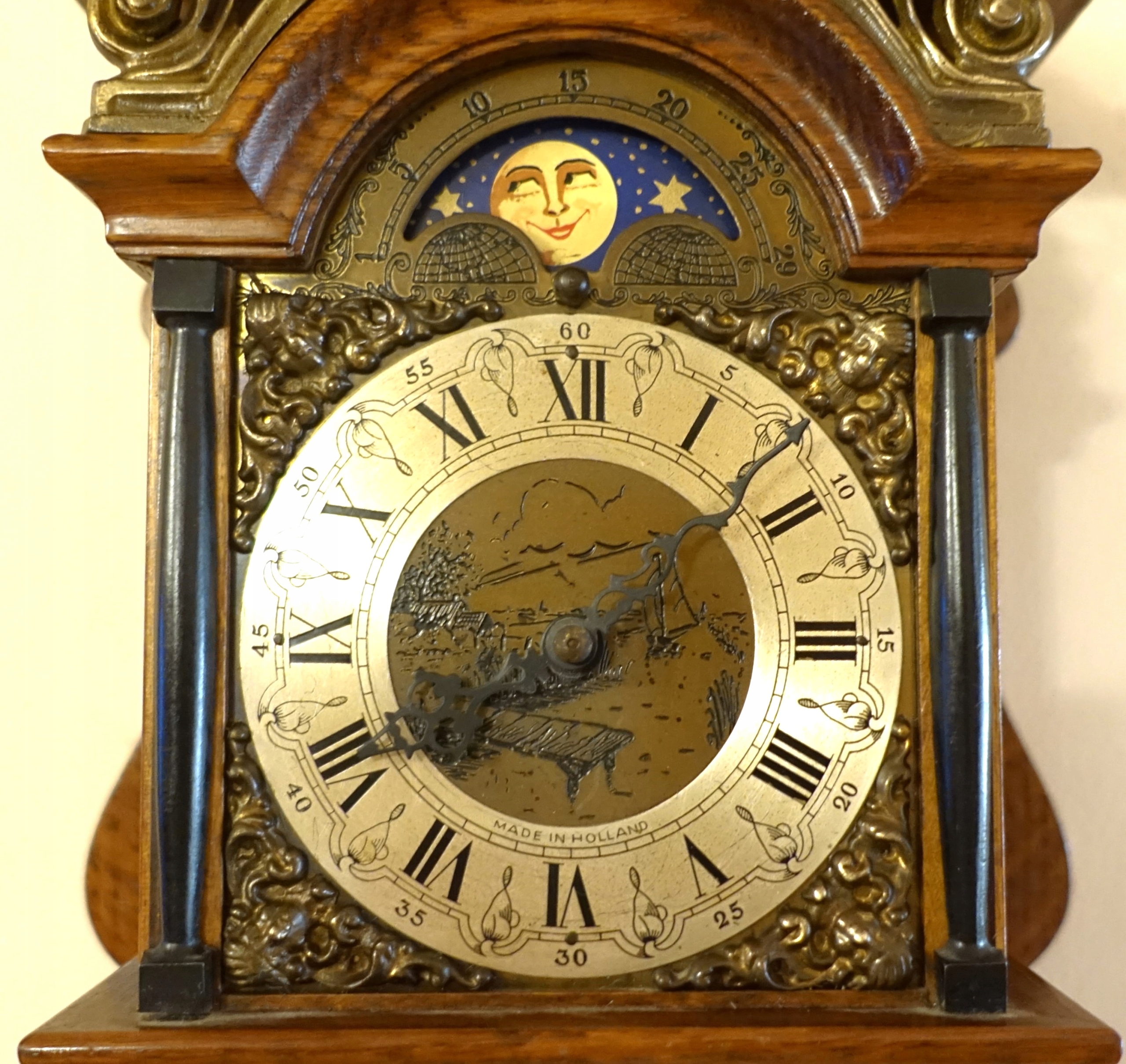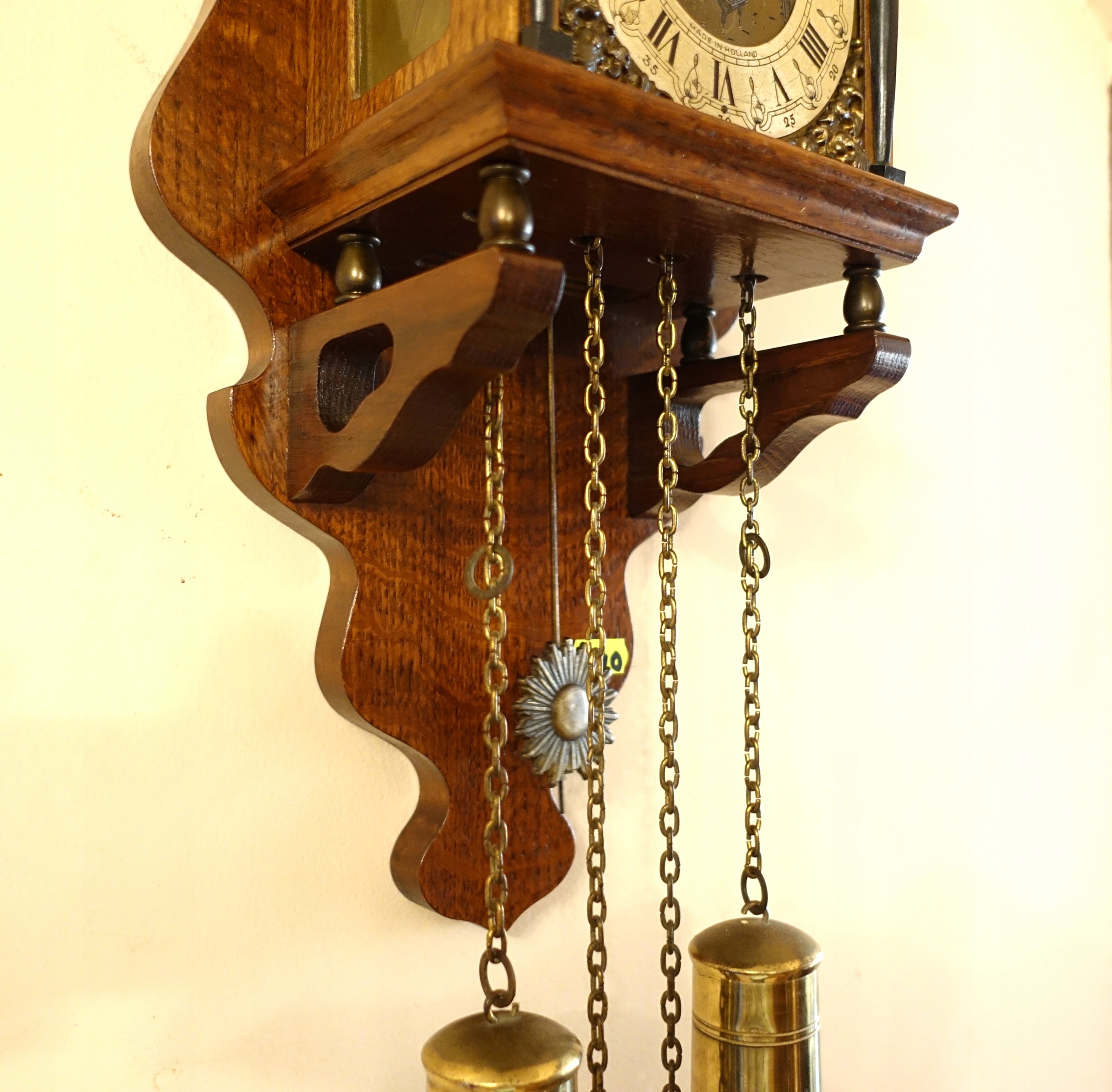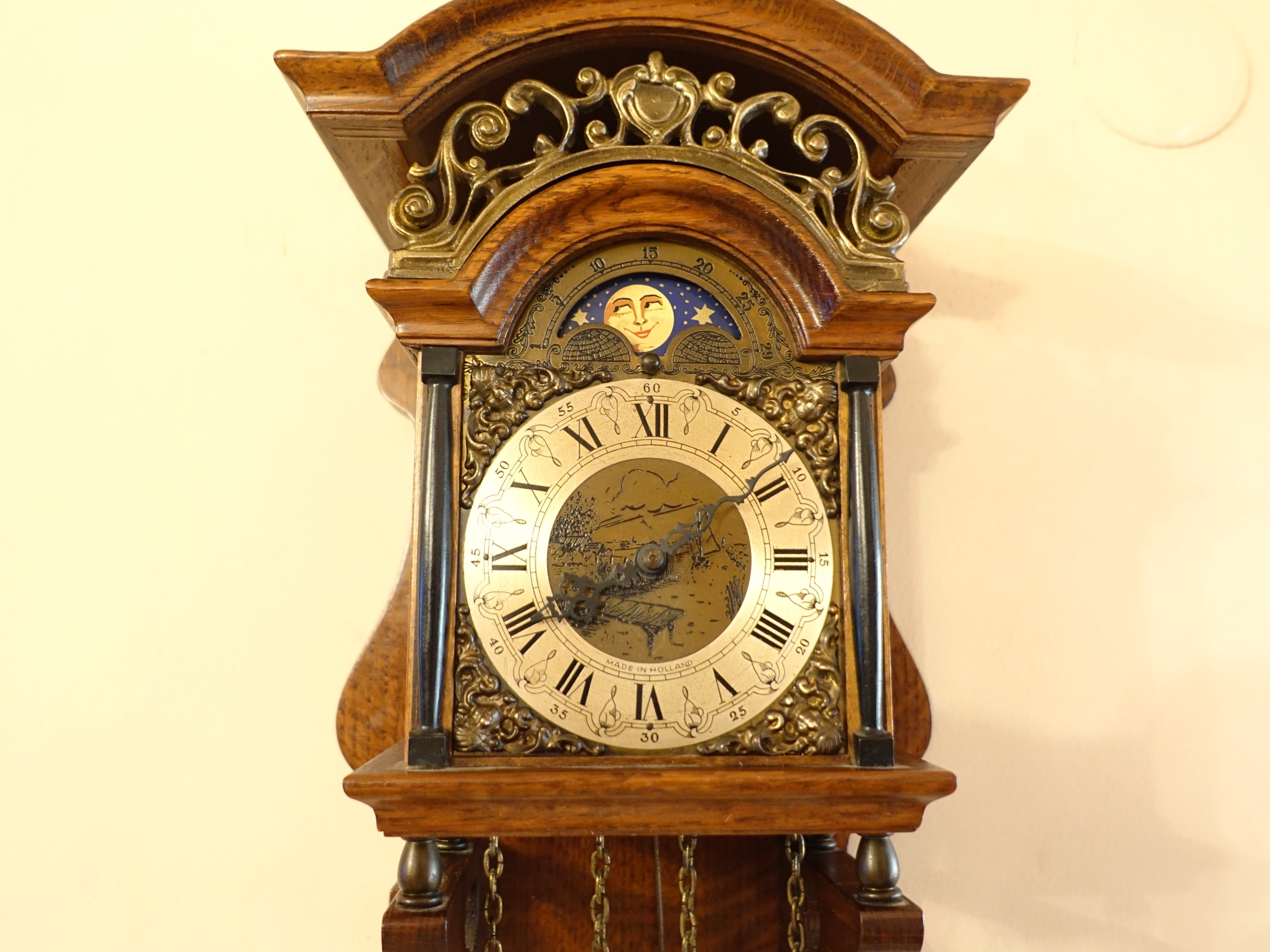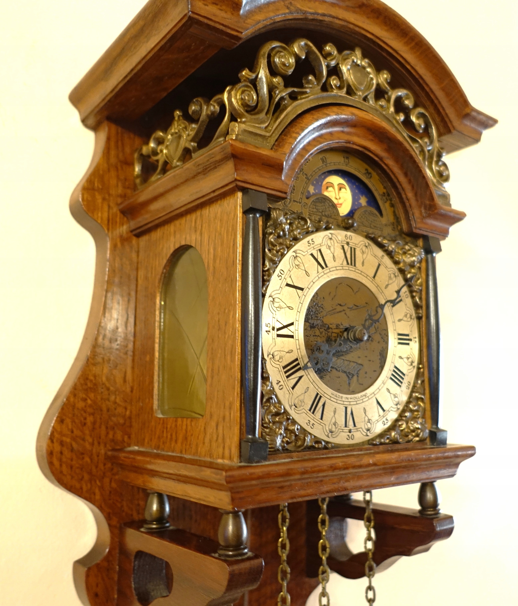 годинникова передача з дерева, шпонована і покрита лаклом з горіхом. Багатий оформлений численними латунними прикрасами, його очищали та зберегли. Товсті латунні прикраси у вигляді корони