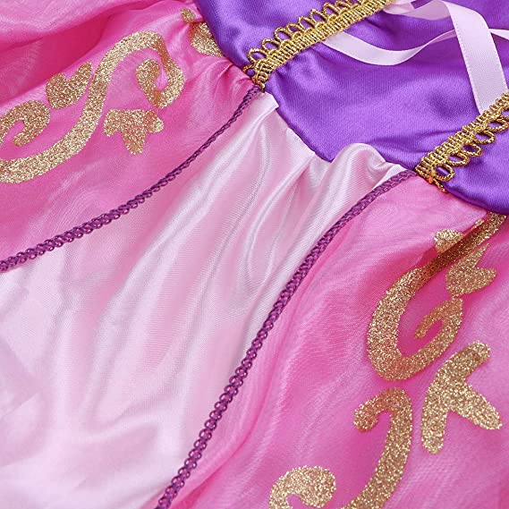 Сукня виконана з поліестеру з бавовною. Виробник подбав про найдрібніші деталі. Сукня красивих фіолетових і рожевих відтінків з красивими аксесуарами. Ретельна обробка, золото, гліттерні прикраси по низу сукні.