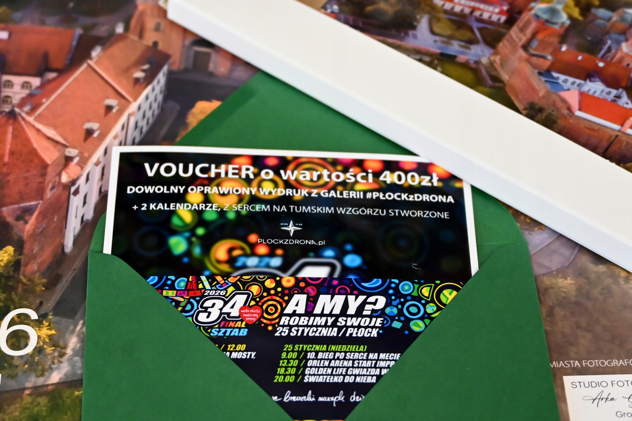 Предметом аукціону є ваучер вартістю 400 злотих на відбиток у рамці з галереї Плоцьк із дрона + 2 авіаційні календарі Плоцька «З серцем на Tumskie Wzgórzu», календар із трьох частин і тринадцять сторінок.