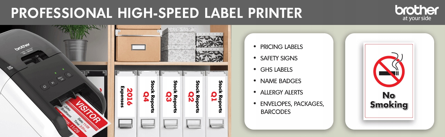 QL-820NWB -це тепловий друк професійних мітків класу. Він характеризується високою швидкістю друку, 110 етикетки в хвилину або 176 мм в секунду в монохромному режимі та 24 мм в секунду у двоколірному режимі.
