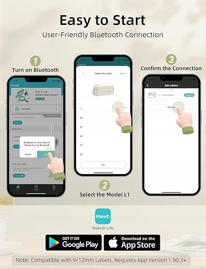 - Створюйте власні етикетки – наклейка Bluetooth підключається без проводів до сумісних телефонів Android або iOS. Просто завантажте безкоштовну програму MakeID-Life і створюйте персоналізовані етикетки, які відповідатимуть потребам вашого дому та офісу!