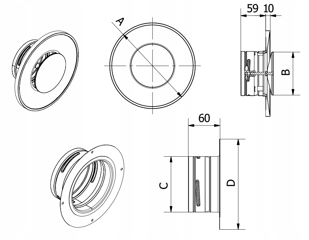 Діапазон регулювання анемостату: Положення головки анемостату було визначено як виступ голівки анемостата відносно поверхні анемостата. Градація вимірювання кожні 2 оберти грибоподібної головки = 2 мм.