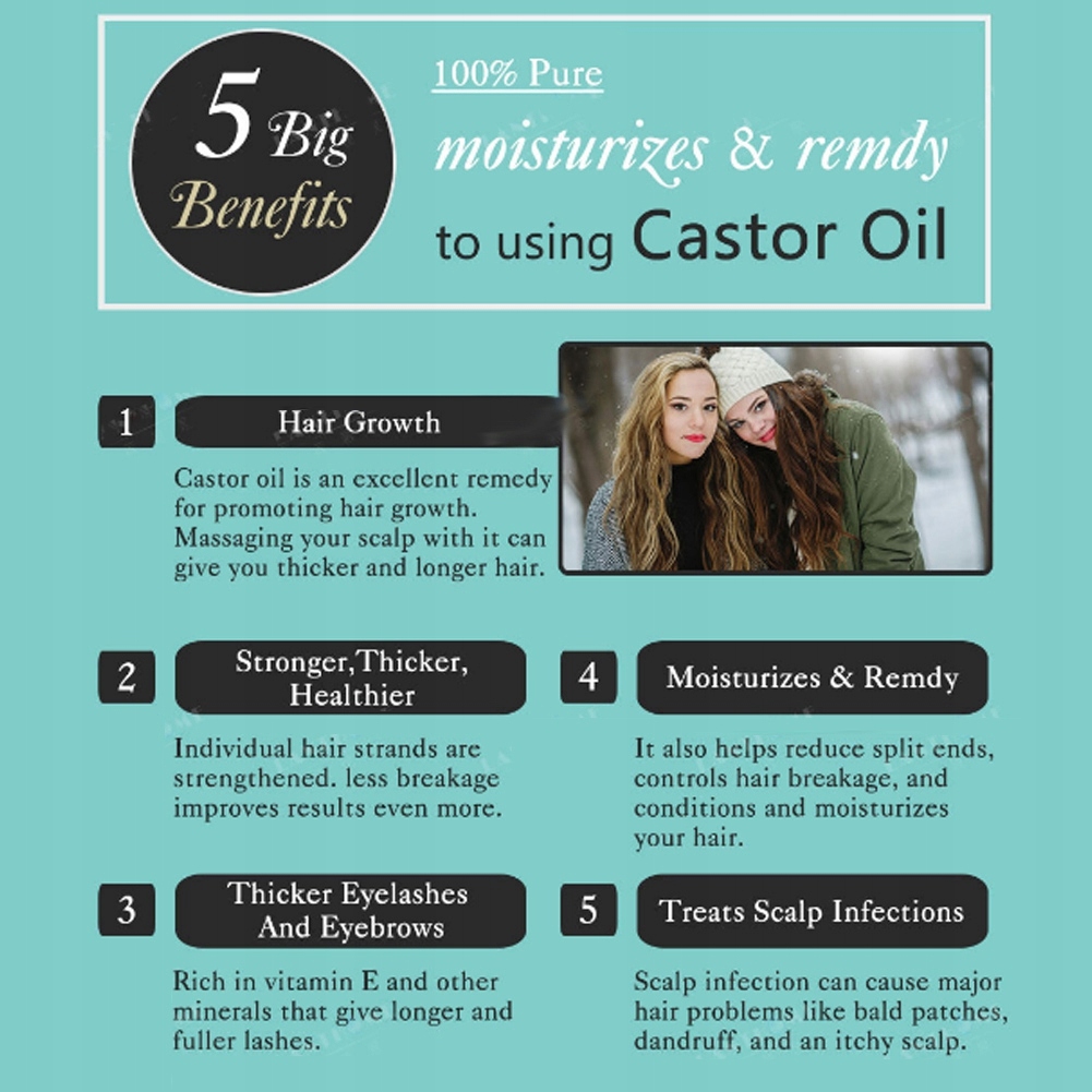 - Натуральне касторове масло для волосся може зволожувати та живити волосся, зменшити розщеплені кінці, контролювати хизування волосся та ефективно стимулювати ріст волосся для поліпшення випадання волосся. Крім того, багаті вітаміном Е та іншими мінералами, які живить ваші вії, роблять їх довшими і товстішими.