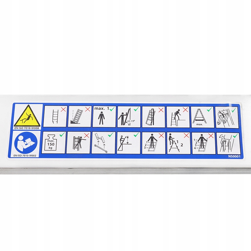 7-ступенева похила драбина. матеріал: алюміній довжина: 187 см ширина: 35 см вага: 2,62 кг рифлені, протиковзкі сходинки пластикові ніжки максимальне навантаження до 150 кг EN ISO 7010-W008, EN ISI 7010-M002