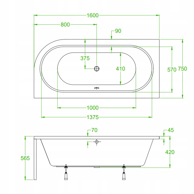 - Чотири регульовані ніжки дозволяють вирівняти ванну, що важливо для рівномірного відтоку води та використання на нерівних поверхнях. < /ul>