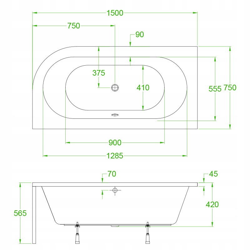 - Посилене додатковою армуючою пластиною товщиною 12 мм, завдяки чому дно ванни не прогинається під вагою навіть двох людей, що купаються.