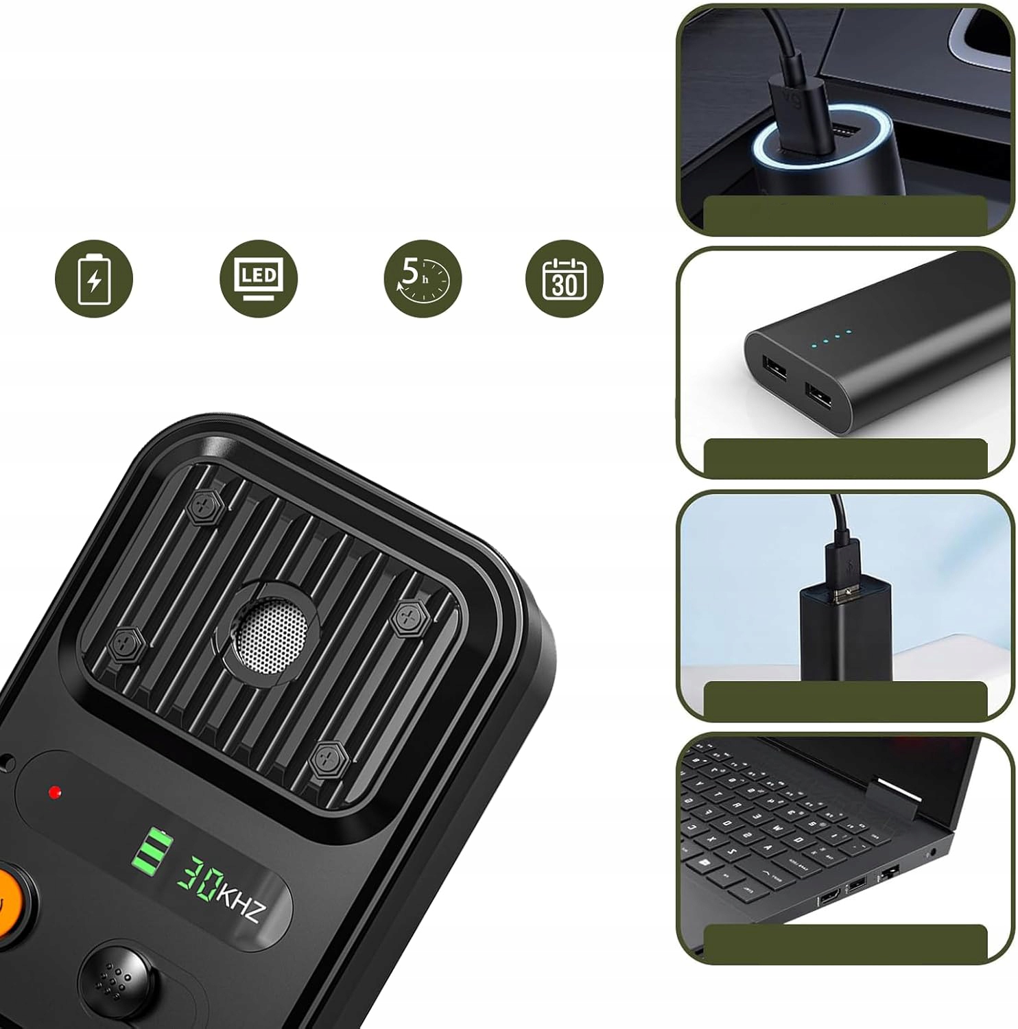 -ultrasonic, нетоксичний, без хімічних речовин, безпечні у використанні, собака може це почути, але вона не буде поранена. 1500 мАг, повністю заряджена всього за 6 годин, може залишатися в режимі готовності близько 60 днів залежно від частоти гавкації собаки. 4