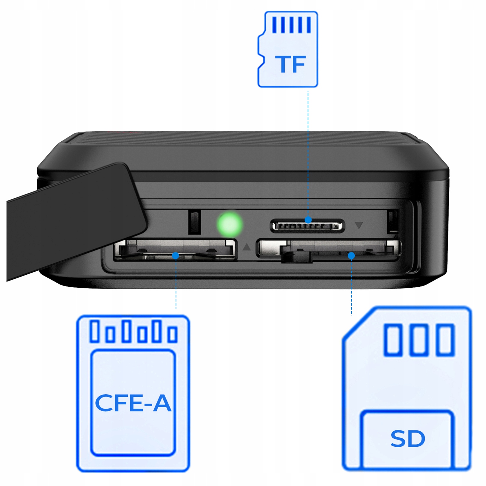 дозволяє зберігати до 13 карт (CFA, SD та TF) в одному місці , гарантуючи замовлення та легкий доступ до кожного з них.