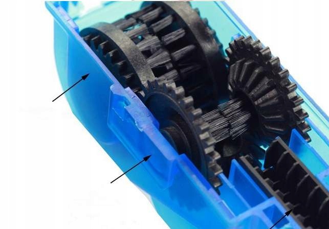 Шість щіток, розташованих всередині пристрою, які приводяться в рух рухомим ланцюжком, розміщеним у пристрої, ретельно очистіть ланки ланцюга.