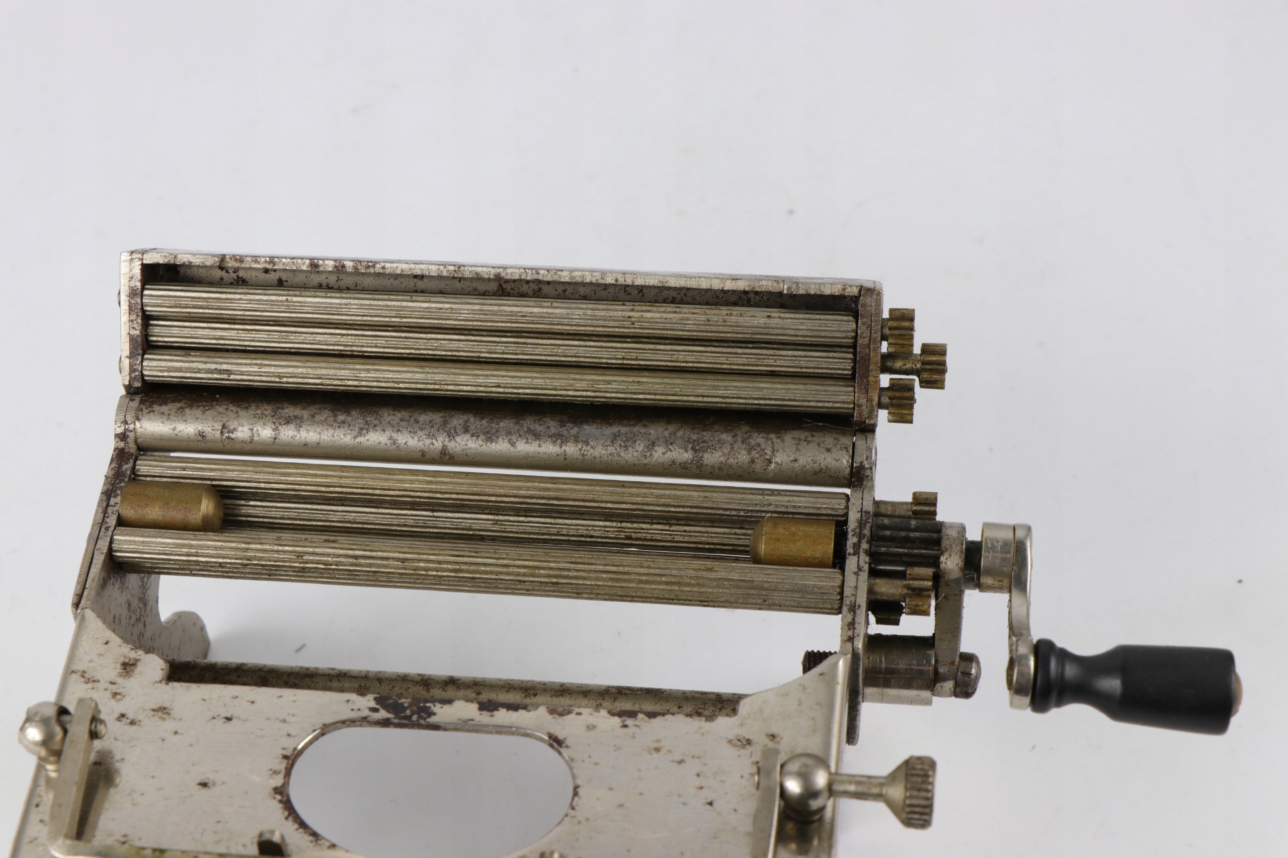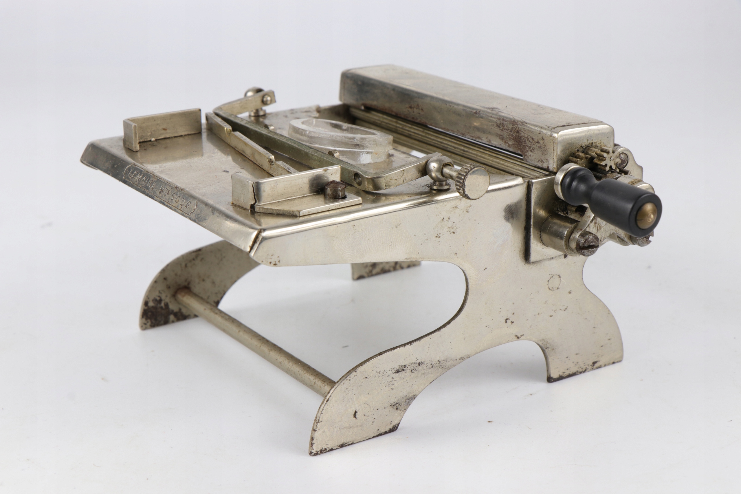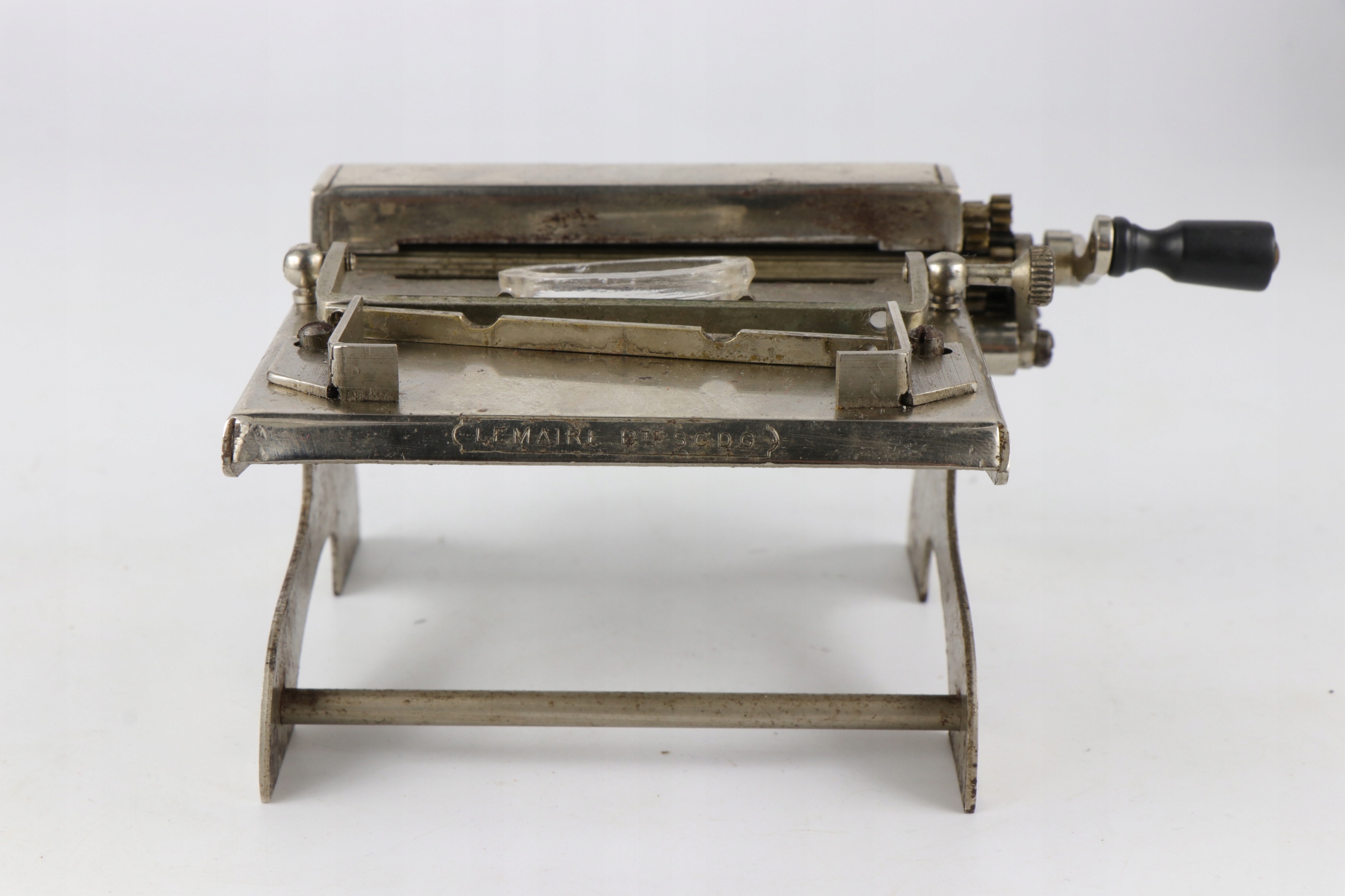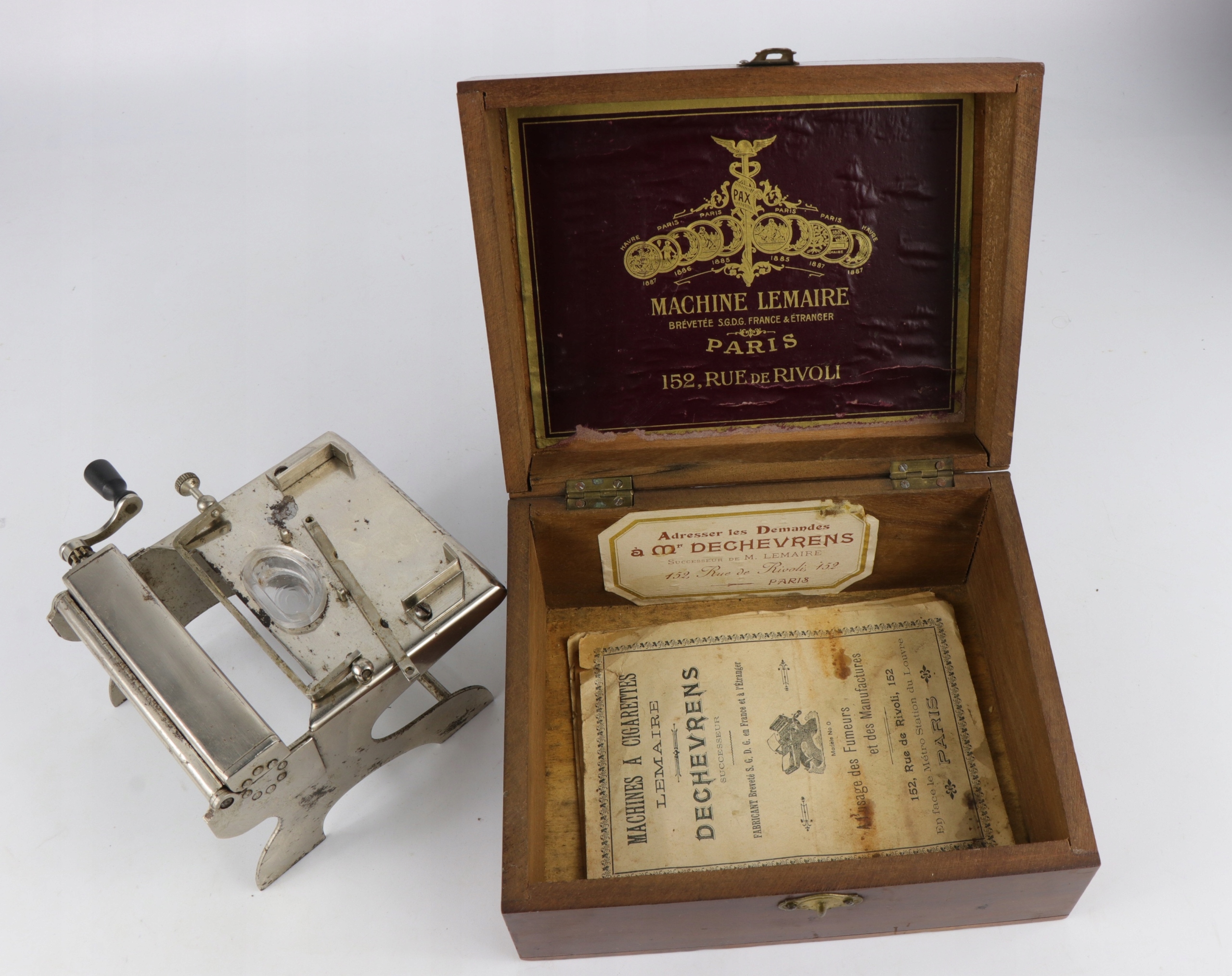 Цікаве пристосування для скручування сигарет. Машина Lemaire model 3 в оригінальній дерев'яній коробці з двома оригінальними листівками на одній даті 1885 (передрук інформації з газет). Машина нікельована, справна, на листівці вказано, що може виготовляти понад 200 сигарет на годину.