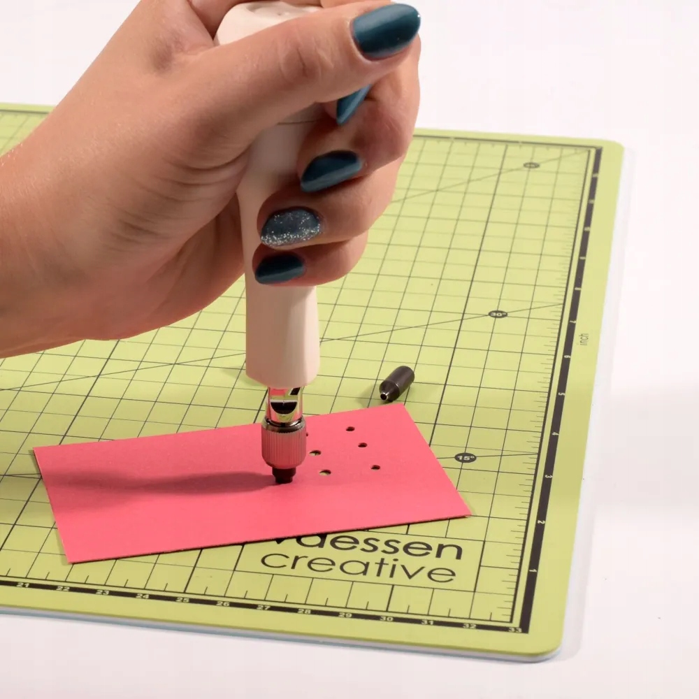 Пристрій має три робочі поради, щоб зробити отвори діаметром 2, 3 та 4 мм. у вас завжди буде їх під рукою. Місце для їх зберігання знаходиться в ручці. Їх заміна не є клопіткою. Не забудьте завжди використовувати пристрій на основі килимка для самостійного використання.