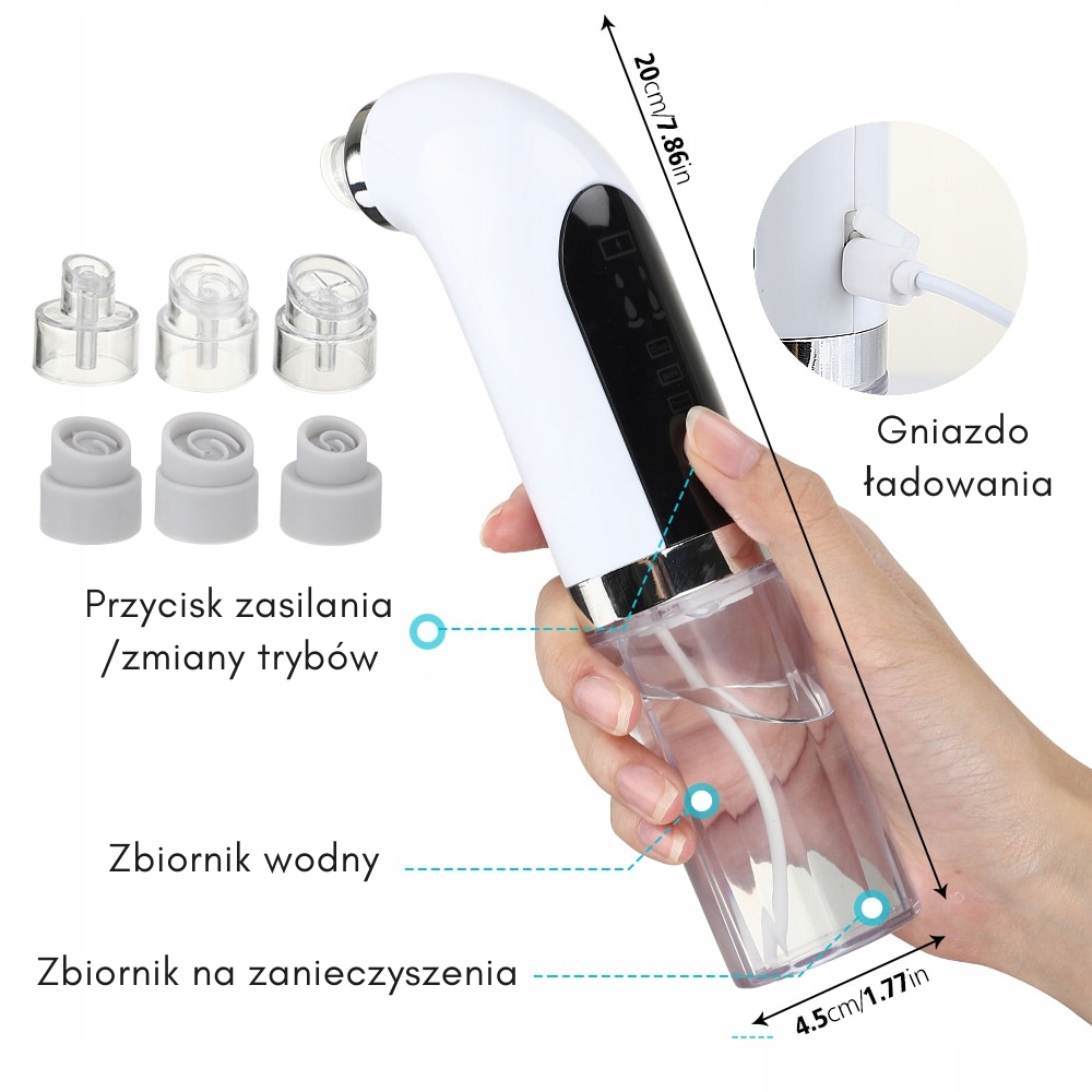 Крок 1: зарядіть пристрій перед першим використанням. Ретельно очистіть шкіру перед процедурою, виберіть відповідний наконечник залежно від ваших потреб і режиму роботи (для сухої, нормальної, жирної шкіри). Налийте очищену воду, препарат від чорних крапок, засіб для зняття макіяжу або фізіологічний розчин (водні продукти без олії) у ємність для збору, у якій розміщено всмоктувальну трубку.