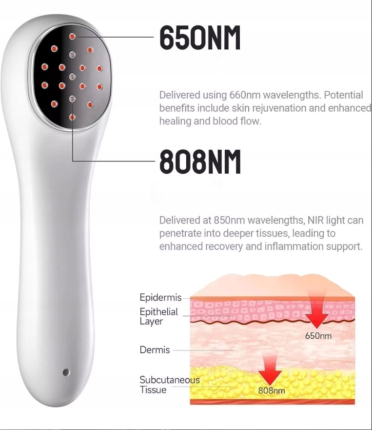 - Червоне світло (650 нм) сприяє кращому кровообігу та регенерації клітин, що допомагає більш швидкому загоєнню поверхневих тканин. 4