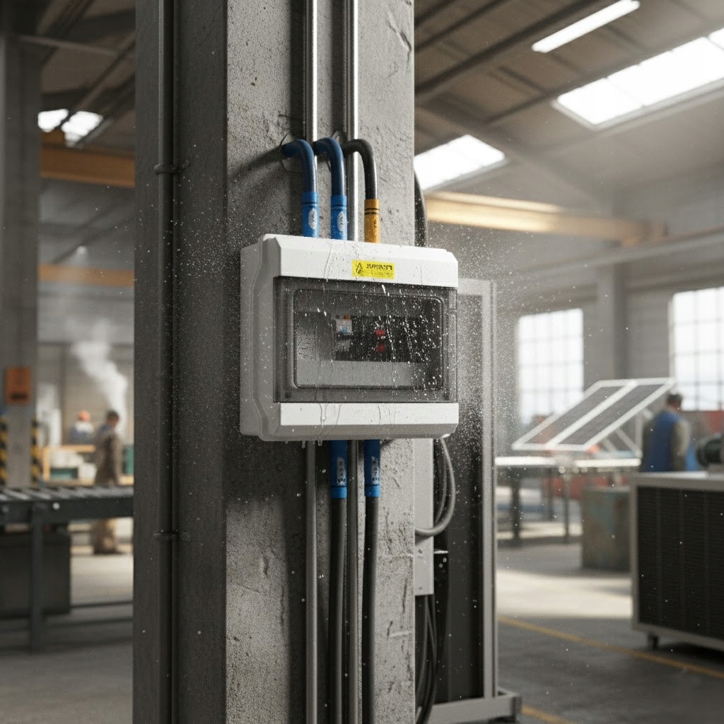 Завдяки цьому рішенню герметична коробка для поверхневого монтажу є особливо придатною для використання в фотоелектричних / фотоелектричних установках / Фотоелектричні системи електропостачаннята в місцях, що піддаються впливу агресивних умов навколишнього середовища, таких як: