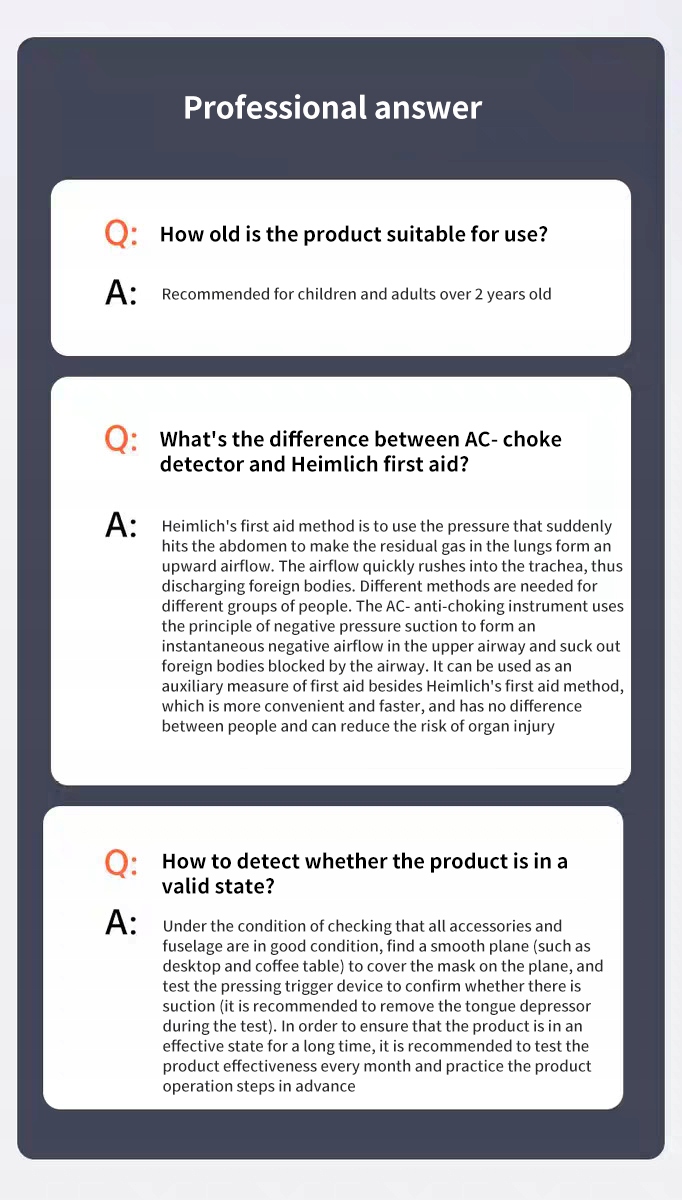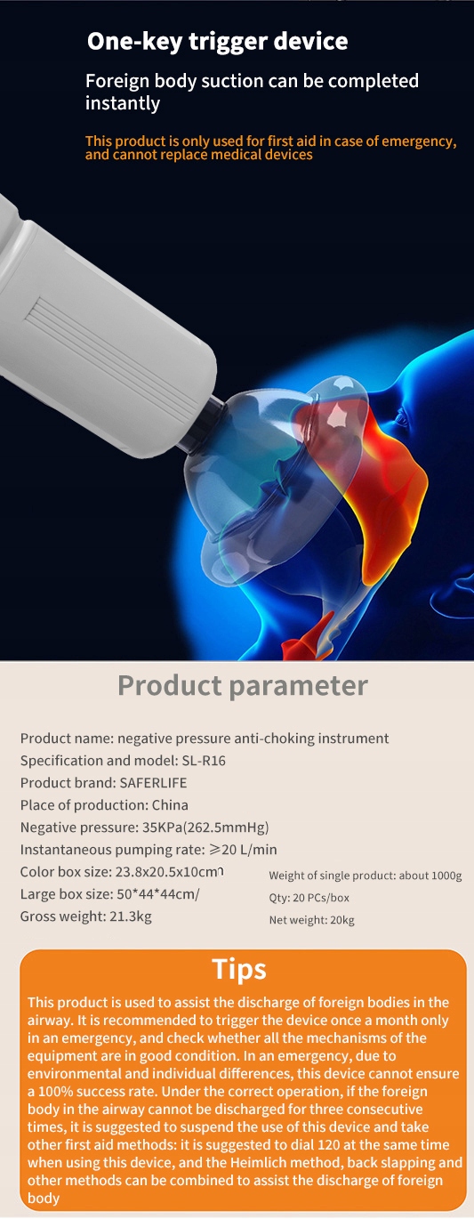 Пристрій проти задухи SAFERLIFE – це рятівний інструмент першої допомоги, призначений для використання в надзвичайних ситуаціях, коли дихальні шляхи заблоковані сторонніми предметами. Завдяки використанню передової вакуумної технології (потужність всмоктування 35 кПа) пристрій може миттєво усувати перешкоди, запобігаючи задусі. Важливо те, що це один із небагатьох пристроїв, безпечних і ефективних для будь-якого віку, від немовлят до 2 років до дорослих і людей похилого віку, який відповідає критичним «золотим 6 хвилинам», щоб уникнути незворотного пошкодження мозку.