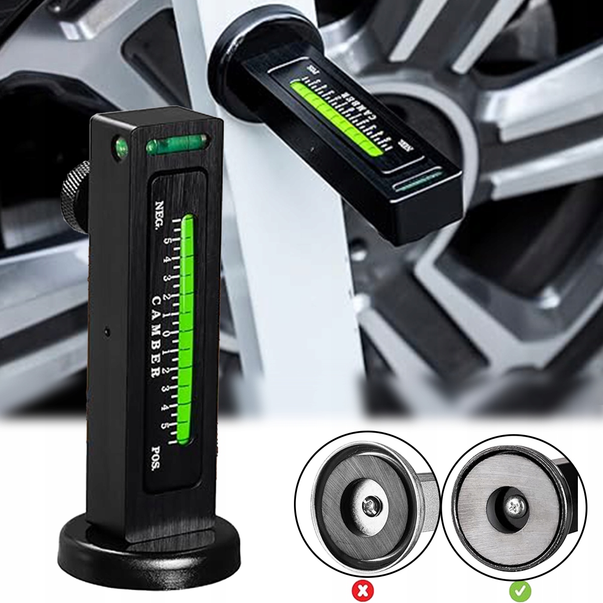 5. Професійний, регульований магнітний лічильник вимірює кут нахилу і нахиляється на колесо на маточини або гальмівному диску, придатний для ремонту пасажирських автомобілів, мотоциклів, фургонів, позашляховиків.