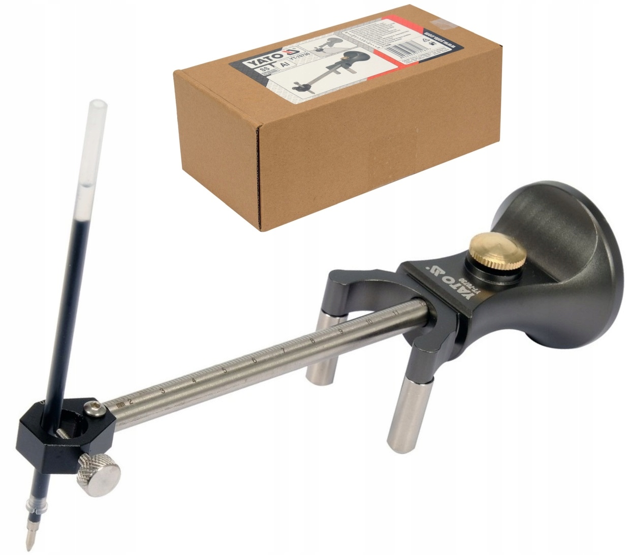 Набір містить стилус для розмітки ліній на металі, маркер для малювання та твердосплавний круг для розмітки на твердих матеріалах, таких як керамічна плитка чи скло. Рука позначена міліметровою шкалою.