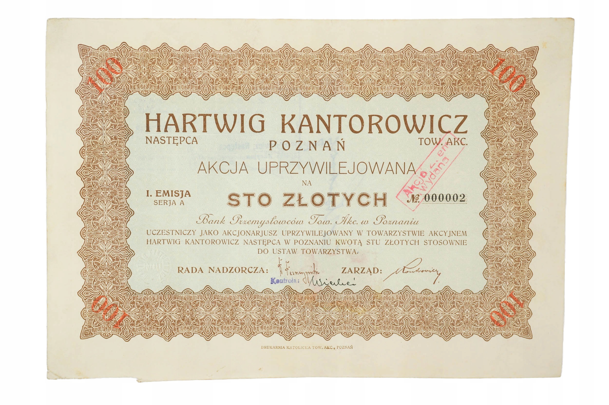 Початковий капітал компанії "Hartwig Kantorowicz Society Society" становив 40 000 000 кв. М і було розділено на 40 000 Акції, з 500 акціями серії А були привілейованими (і продаються за ставкою 130% номіналу), 39 000 акцій серії B (продаються на ході 110% номіналу). Джерело: https://wielkopolskahistoryczne.pl/2021/07/30/hartwig-kantorowicz-zanim-runki-objeto-monopol/
