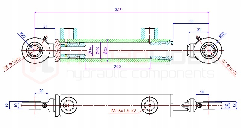 ЦИЛІНДР ГІДРОЦИЛІНДР 2-STR 25/16 ХОД 200 + Кріплення ГІДРОЛІДЕРА