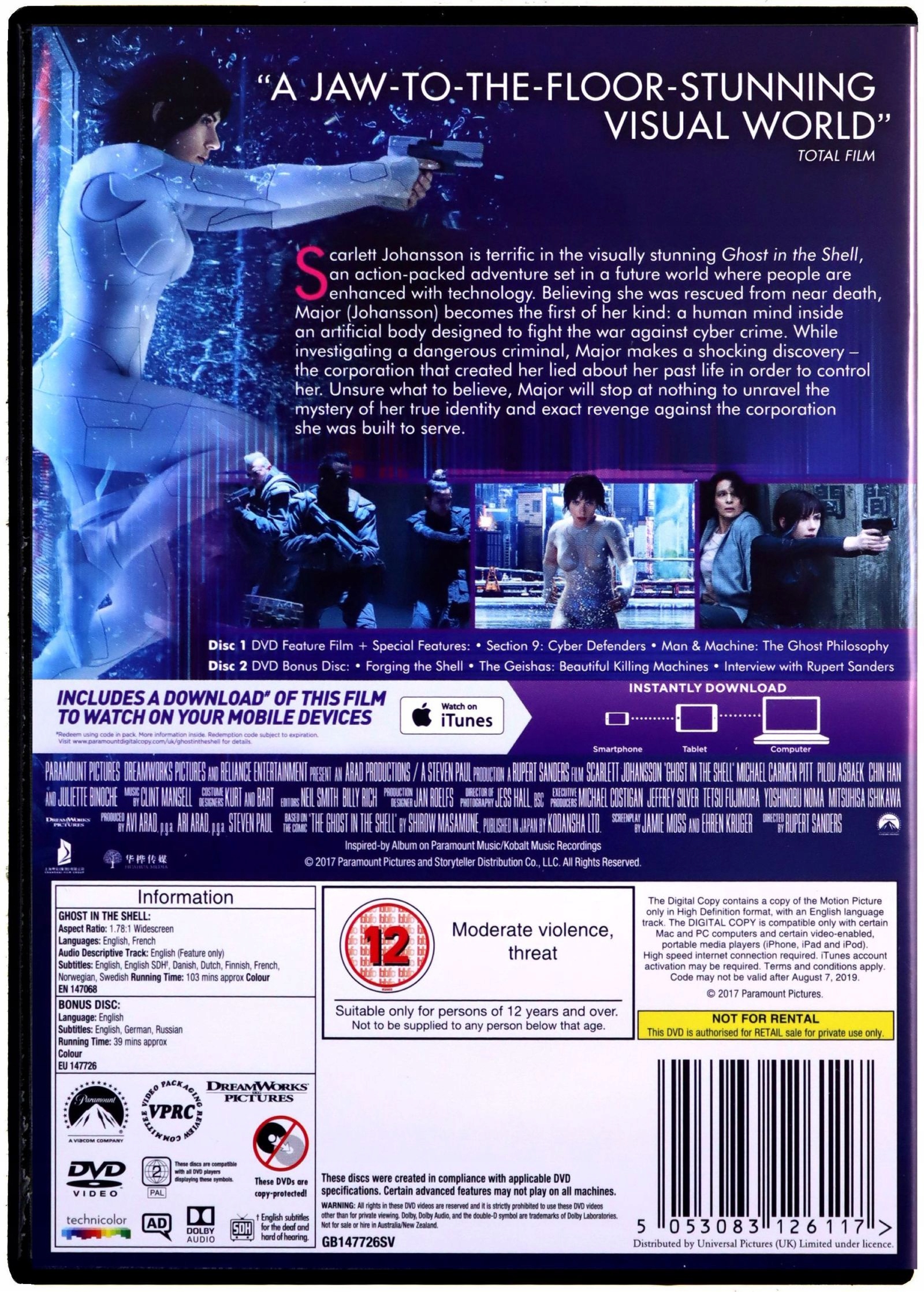 Скарлетт Йоханссон грає головну роль у вражаючому фільмі «Привид в обладунках», дія якого відбувається у світі майбутнього, де технології дозволяють вдосконалювати людину. Вірячи, що її врятовано з лап смерті, Мейджор (Йоханссон) стає першим представником нового виду: людського розуму, замкненого в штучному тілі для боротьби з кіберзлочинністю. Переслідуючи небезпечного злочинця, вона робить шокуюче відкриття - творці приховали правду про її минуле, щоб мати над нею повний контроль. Майор більше не знає, у що вірити, але вона не зупиниться ні перед чим, щоб дізнатися свою справжню особистість і помститися корпорації, якій вона мала служити.
