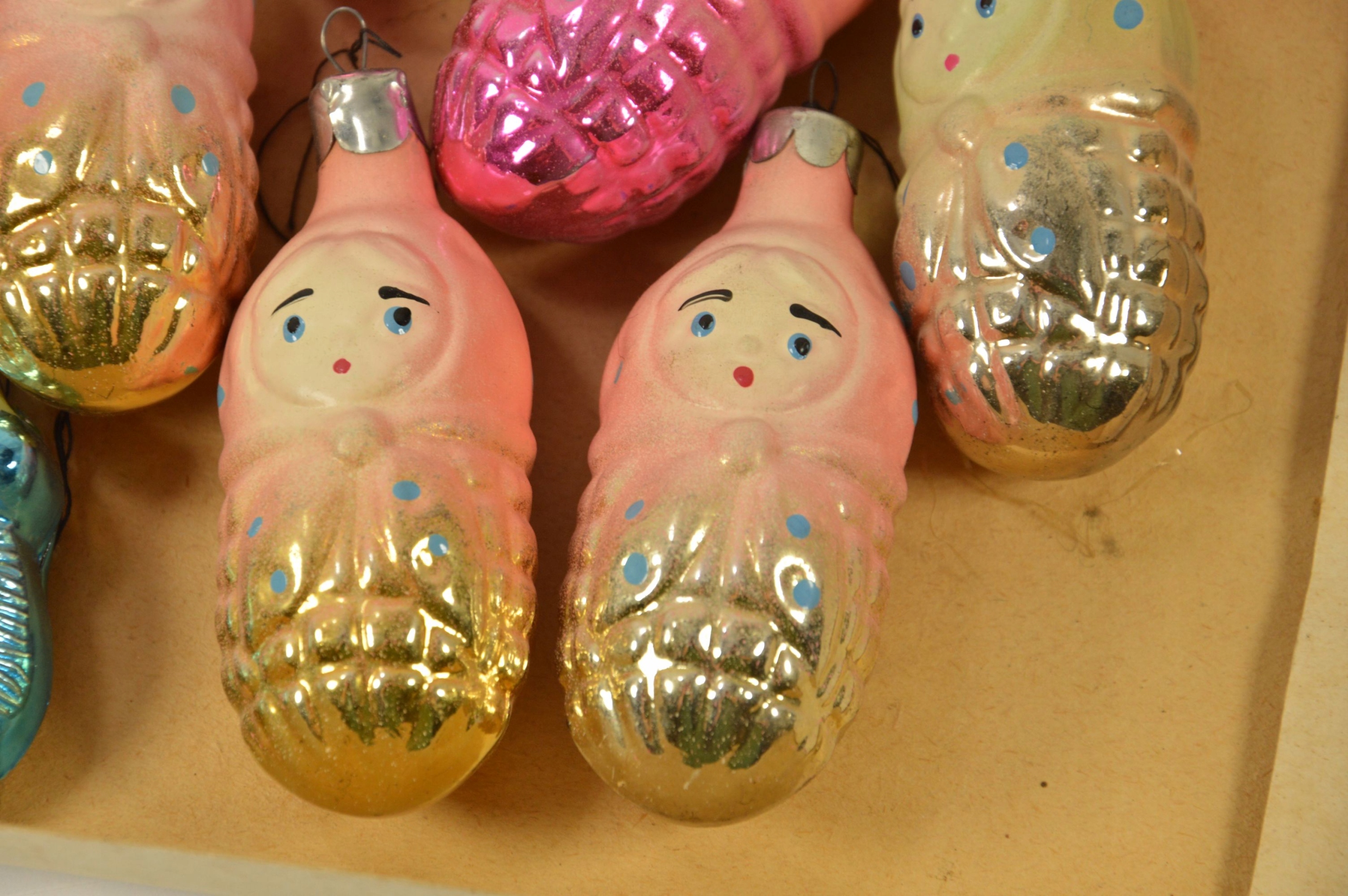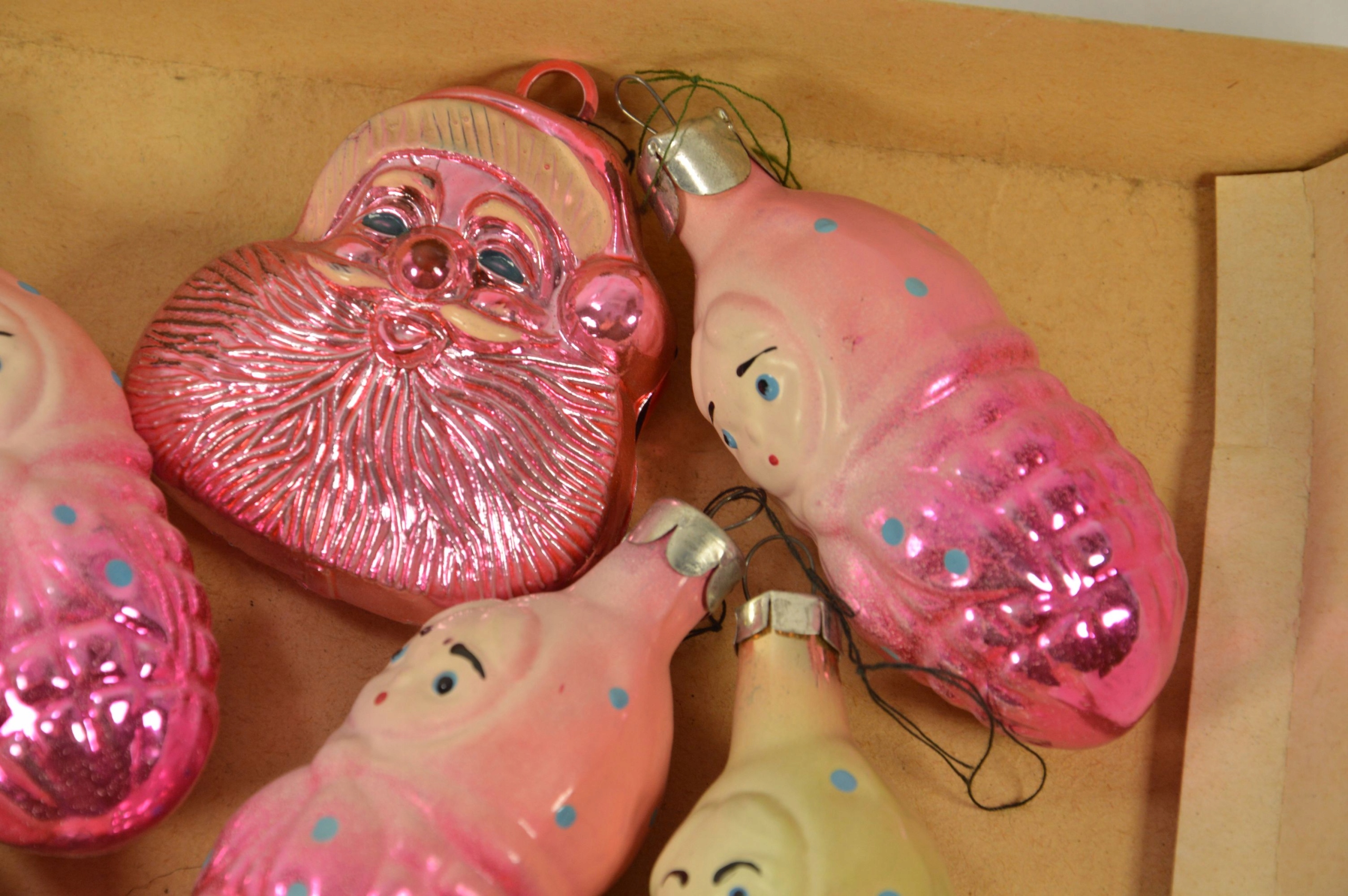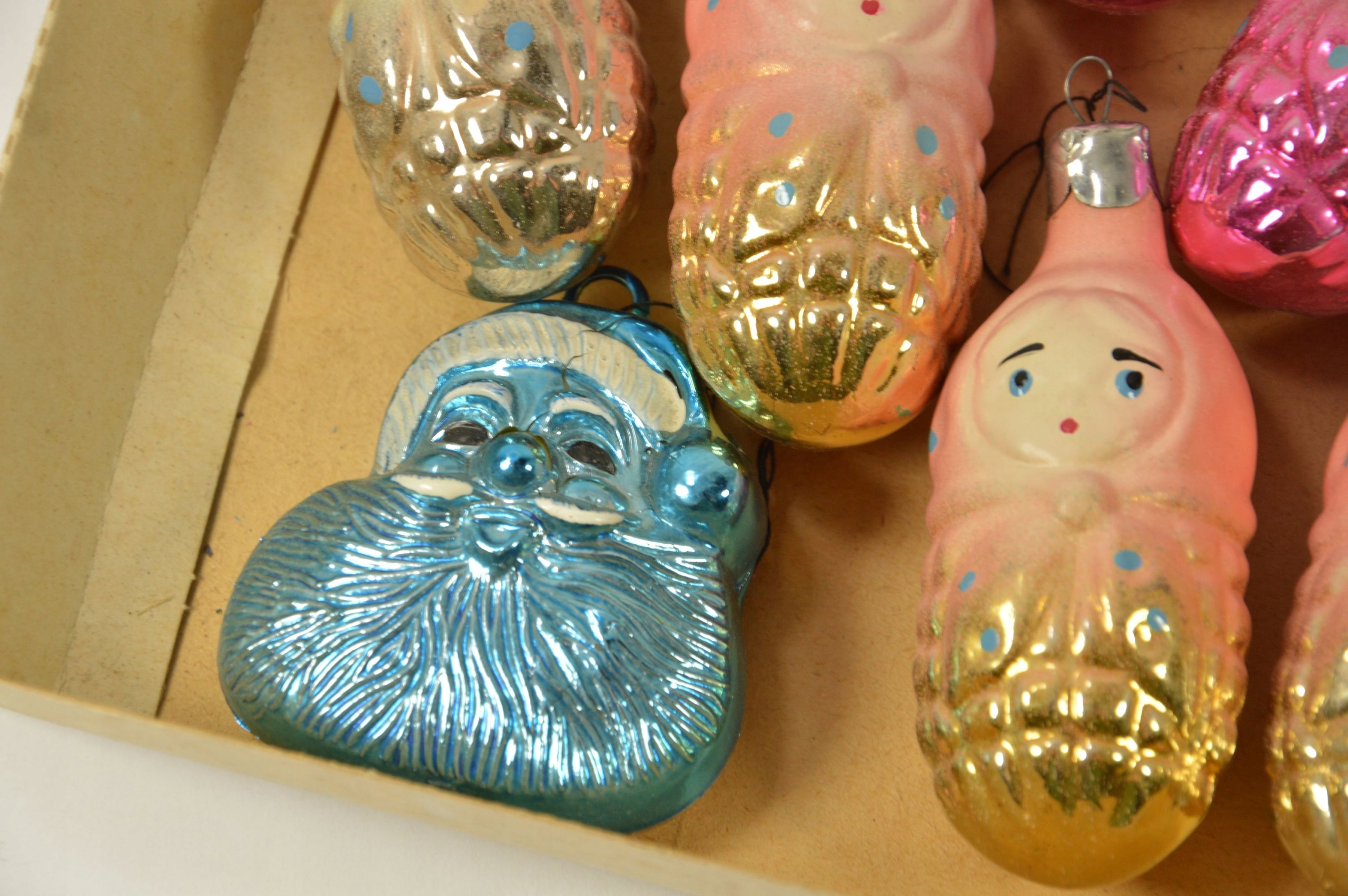 Набір оригінальних ялинкових кульок часів Польської Народної Республіки. Набір 11 предметів, дуже добре збережені, без пошкоджень. Діди Морози з пластику, скляні шишки. Упаковка з підписом.