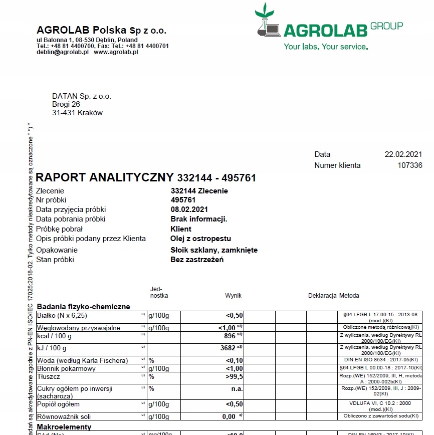 Наші олії проходять лабораторні дослідження, щоб підтвердити автентичність і високу якість наших олій. На фото – фрагмент лабораторного дослідження. Повний звіт доступний за запитом.