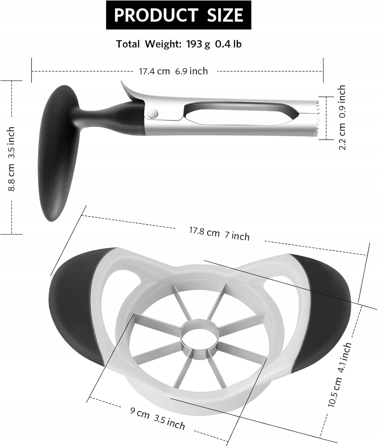 - Цей набір містить 18 см яблучного різаки та 18 см яблучного котла. Виготовлений з нержавіючої сталі, призначеної для контакту з їжею, пластиком та TPR.