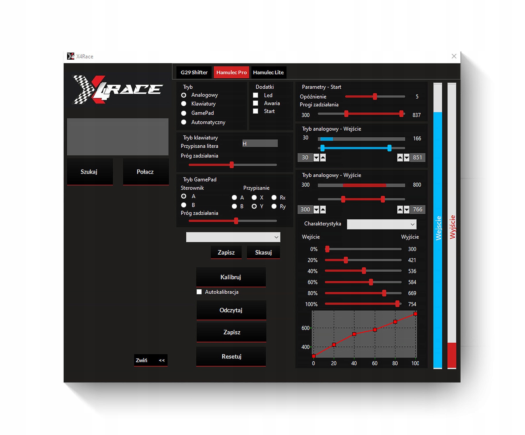 Отримайте ще більший контроль над точністю в аналоговому режимі. X4Race Tool PRO дозволяє регулювати діапазон вихідного сигналу та формувати криву сигналу відповідно до ваших уподобань. Виберіть лінійні, експоненціальні або логарифмічні характеристики гальм і контролюйте кожен рух важеля.