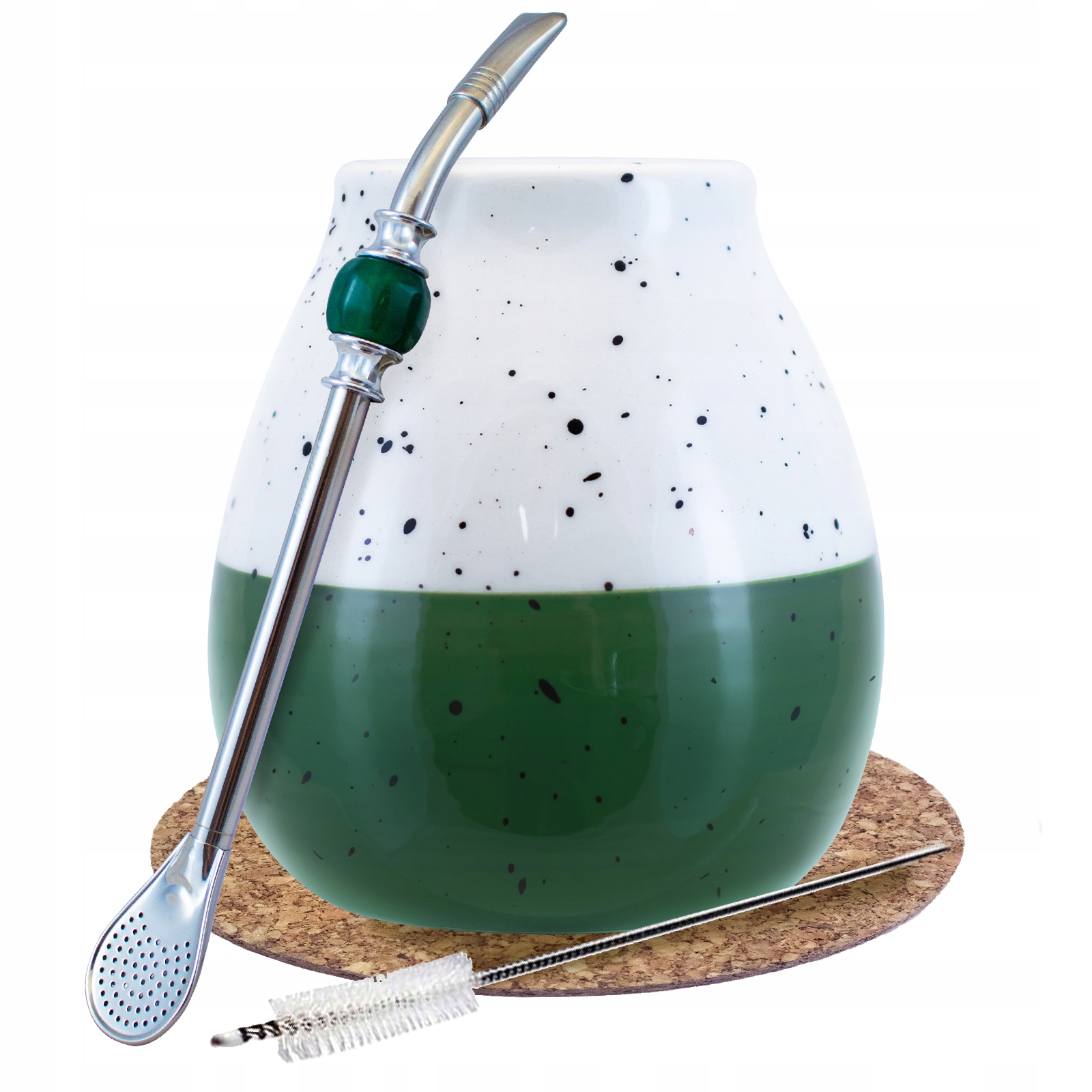 Це стильна посудина йерба мате місткістю приблизно 350 мл. За формою нагадує класичний гарбуз. Засклені всередині і зовні. Оздоблення в світлому кольорі, з чорними нерівними плямами і дизайнерським вирізом внизу - в зеленому кольорі. Matero міцно виготовлений з високоякісної кераміки. Він стійкий до механічних пошкоджень. Пити йербу з такої посудини – суцільне задоволення!