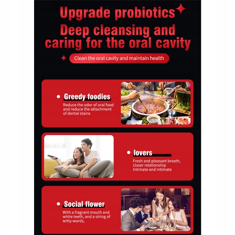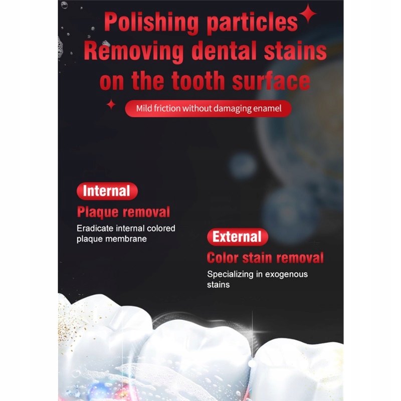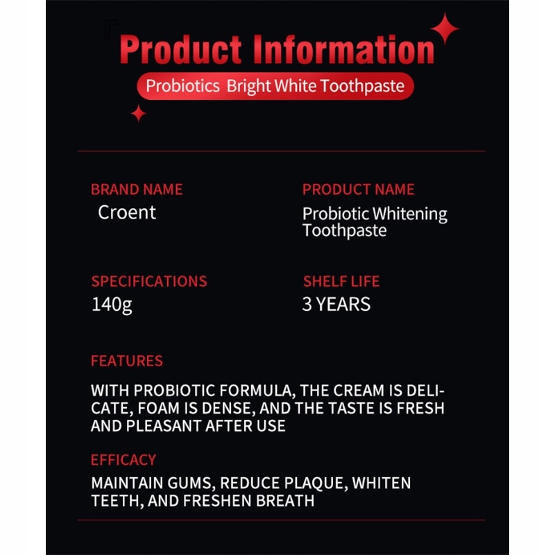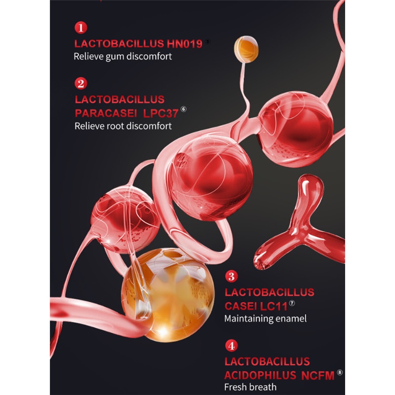Містить 6 типів пробіотиків, ефективно видаляє залишки кави, чаю тощо, розчиняє зміни кольору на поверхні зубів, забезпечує свіже дихання та дозволяє вашій посмішці розквітати сяючою та впевненою.