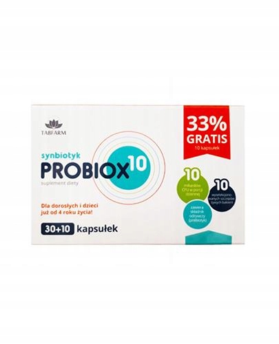 Probiox 10 - це добавка для дорослих та дітей старше 4 років, вказаних для споживання для збагачення дієти корисними пробіотичними бактеріями. Для підтримки імунітету, травлення та реконструкції кишкової бактеріальної флори. Особливо вказано під час антибіотичної терапії та після нього.