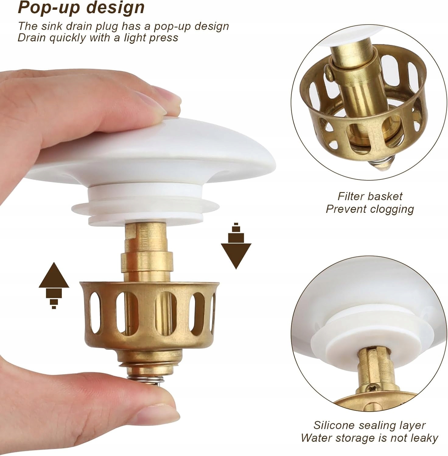 Висувна конструкція Сито для раковини має висувну конструкцію, яку можна швидко опорожнити обережним натисканням, і має хорошу еластичність для запобігання неприємним запахам. Легке встановлення. Під’єднайте та використовуйте сито для кухонної раковини без інструментів — не потрібно знімати злив — просто вийміть старий зливний сердечник і вставте пружинну пробку раковини. Запобігайте засміченню Пробка раковини оснащена фільтрувальним кошиком, і волосся накопичується в фільтруючому кошику, ефективно запобігаючи засміченню водопровідної труби. З цим зливним краном вам не доведеться турбуватися про дрібні предмети, такі як кільця, які випадково впадуть у каналізацію. Матеріал Високоякісний фільтруючий елемент і кошик виготовлені з латуні, яку нелегко заржавіти або відчути. Кришка зроблена з кераміки, яка виглядає краще після встановлення. Хороша сумісність Фільтр раковини має внутрішній діаметр 345 мм і підходить для більшості труб.
