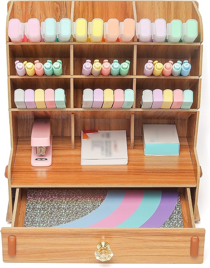 - - акуратно: Цей організатор дерев’яного столу призначений для зберігання багатьох різних стаціонарних статей та документів. До офісу, школи, навчання та дому. 9 елементів, розташованих на 3 рівні, утримують більшу частину розмірів ручок та пензлів. Нижній шар і ящик призначені для ноутбуків, зошитів, листів, паперових документів тощо. Продовжуйте замовлення та замовлення на столі, зробіть зберігання та пошук файлів прозорим та ефективним.