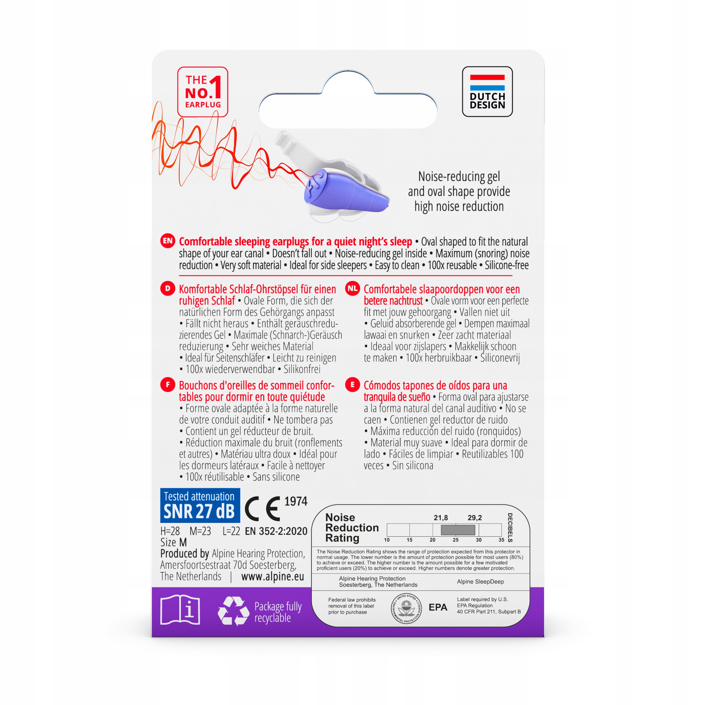 SleepDeep ALPINE містить спеціальний шумопоглинаючий гель, який забезпечує максимальну амортизацію, полегшує засинання та запобігає легкому пробудженню. Середнє затухання (SNR) вилок становить 27 дБ.